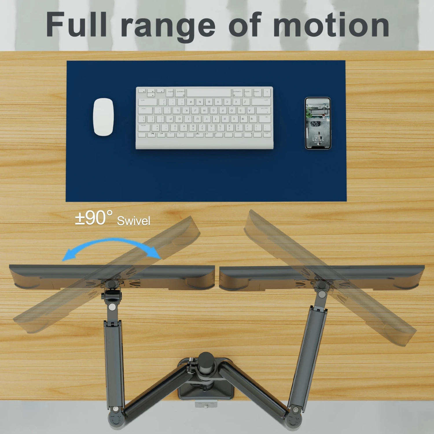 <Customize Your Viewing Experience>With ergonomic design, ErgoFocus dual monitor mount provides +90ยฐ to -90ยฐ of monitor tilt, 180ยฐ of swivel, and 360ยฐ of rotation to maximize ergonomic comfort. You can easily adjust the position of your monitors with this dual monitor arm to suit your needs.