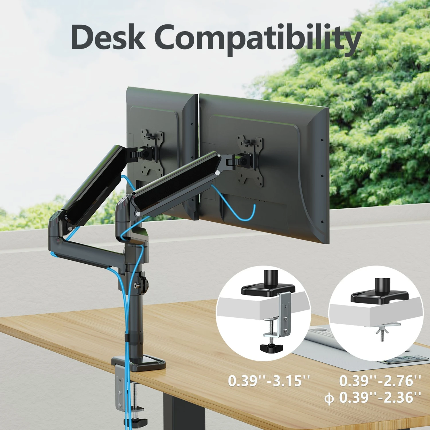 <Easy Installation>This 2 monitor desk mount with pole is quick and easy to install with the included hardware and instruction manual. Simply attach it to the edge of your desk and adjust to your desired position in 10 minutes