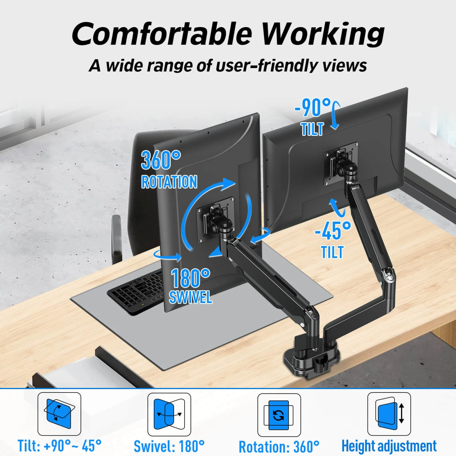 <Comfortable Working>The ultrawide monitor arm offers full monitor movement with 20.85″ of arm extension, rising 21.45″ from the work surface; customize how you work or collaborate with 360° of rotation, 180° of swivel and +90°/ -45° of tilt. 180°/360°swivel on arms, you’ll be able to pose your screen where you want it. Increases viewing comfort by noticeably reducing strain on the eyes, back, and neck.