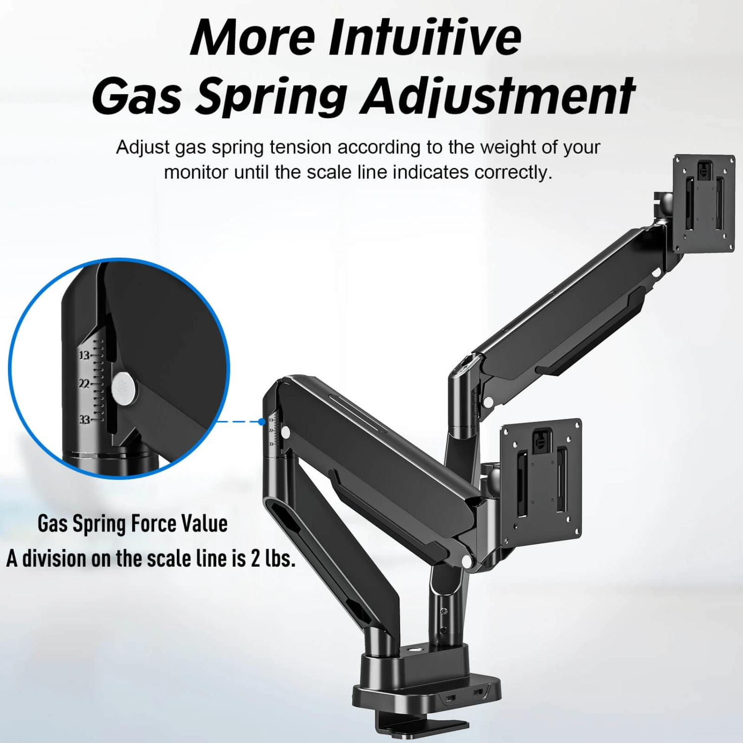 <Stylish & Functional>The modern design is sleek and lightweight. Thanks to a streamlined cable routing under the arm, annoying cables remain outside the work area. In space-constrained areas, the monitor mount can be folded back to save space. When you adjust the tension, you can read the gas spring force from in the arm joint.