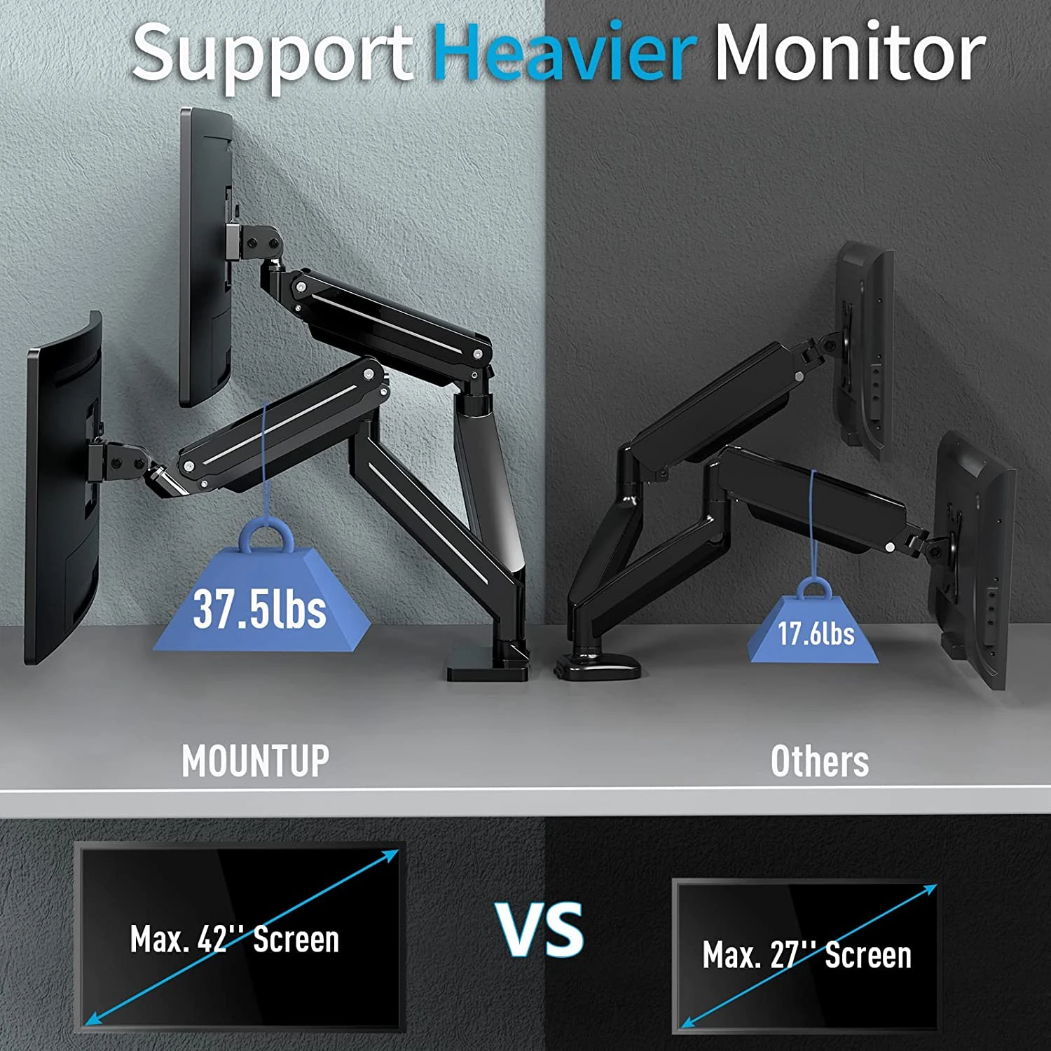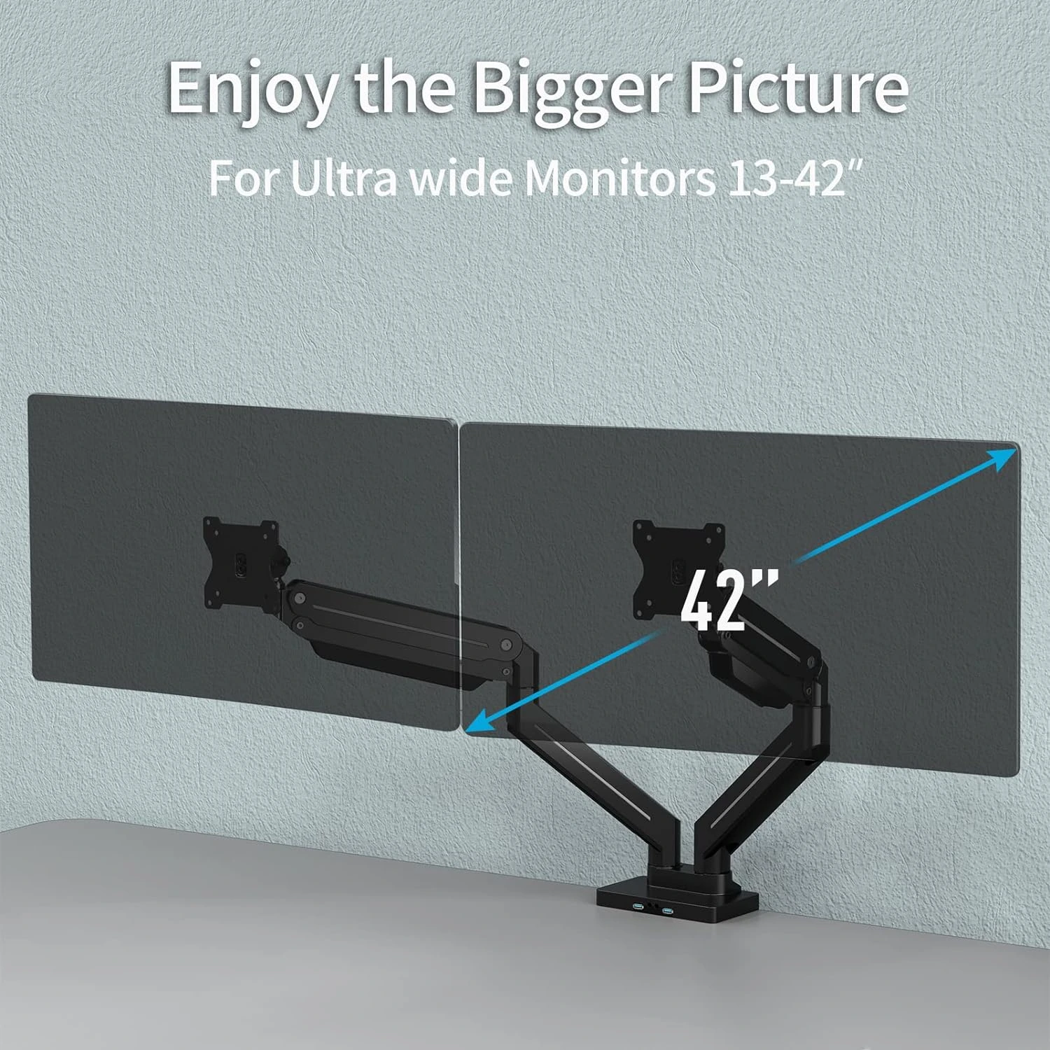 <Fits Larger Monitors up to 42’’>This dual monitor arm fits 2 13”-42” monitors. Each arm loads a weight from 2.2 lbs. to 37.5 lbs. It is compatible with VESA patterns of 75x75mm and 100x100mm. It works with most monitor brands, including Dell, Acer, Alienware, AOC, Asus, BenQ, LG, NEC, Planar, Samsung, ViewSonic, etc.