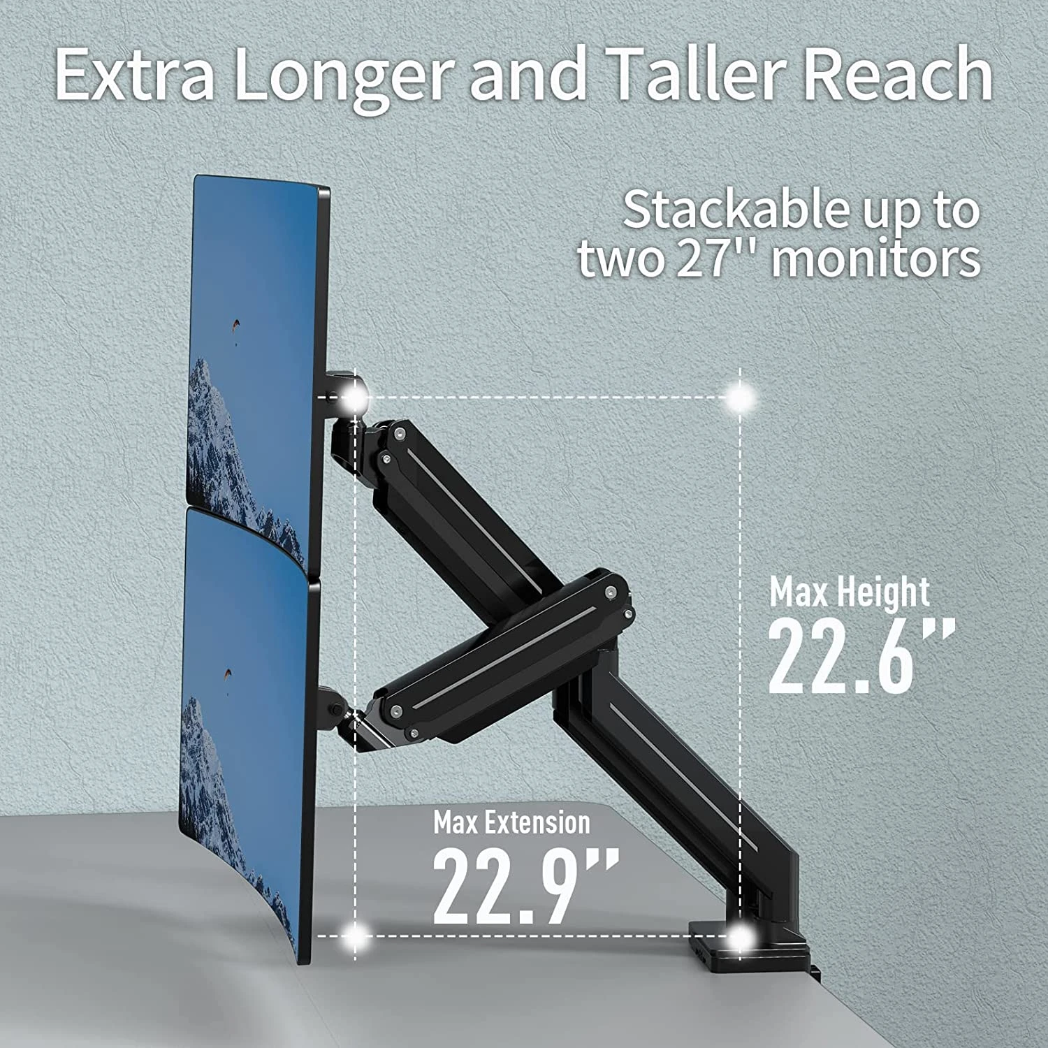 <Full motion & Longer and Taller Reach>With an extension of 22.9”, a height adjustment of 22.6”, and a 360° swivel on three joints, you’ll be able to pose your screen where you want it. The monitor mount is equipped with from -25° to 25° tilt, ±90°swivel left/right, and 360°rotation. With the ability to easily adjust your screens, you’ll be able to work with your team and collaborate effortlessly while rotating between portrait and landscape positions.