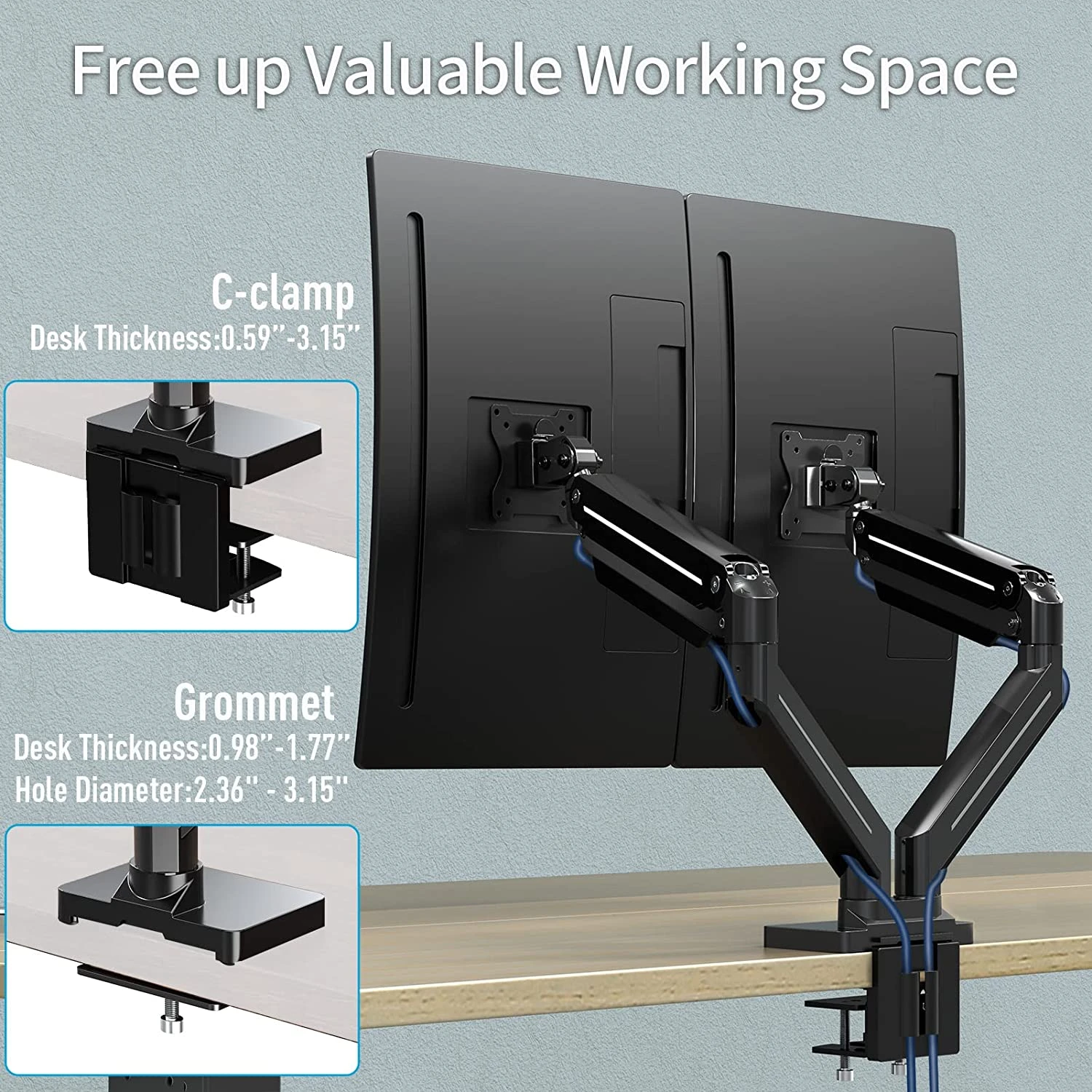 <Worry-free Assembly>We’ve made installation a breeze, giving you two assembly options using either the C-clamp or the grommet mounting. The C-clamp fits the desktops 0.59″ – 3.15″ thick and the grommet mounting fits the desktops 0.98″ – 1.77″ thick with a bolt-through hole 2.36″ – 3.15″. With easy-to-follow instructions and labeled parts, this dual monitor arm can be assembled quickly and easily.