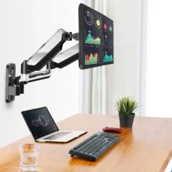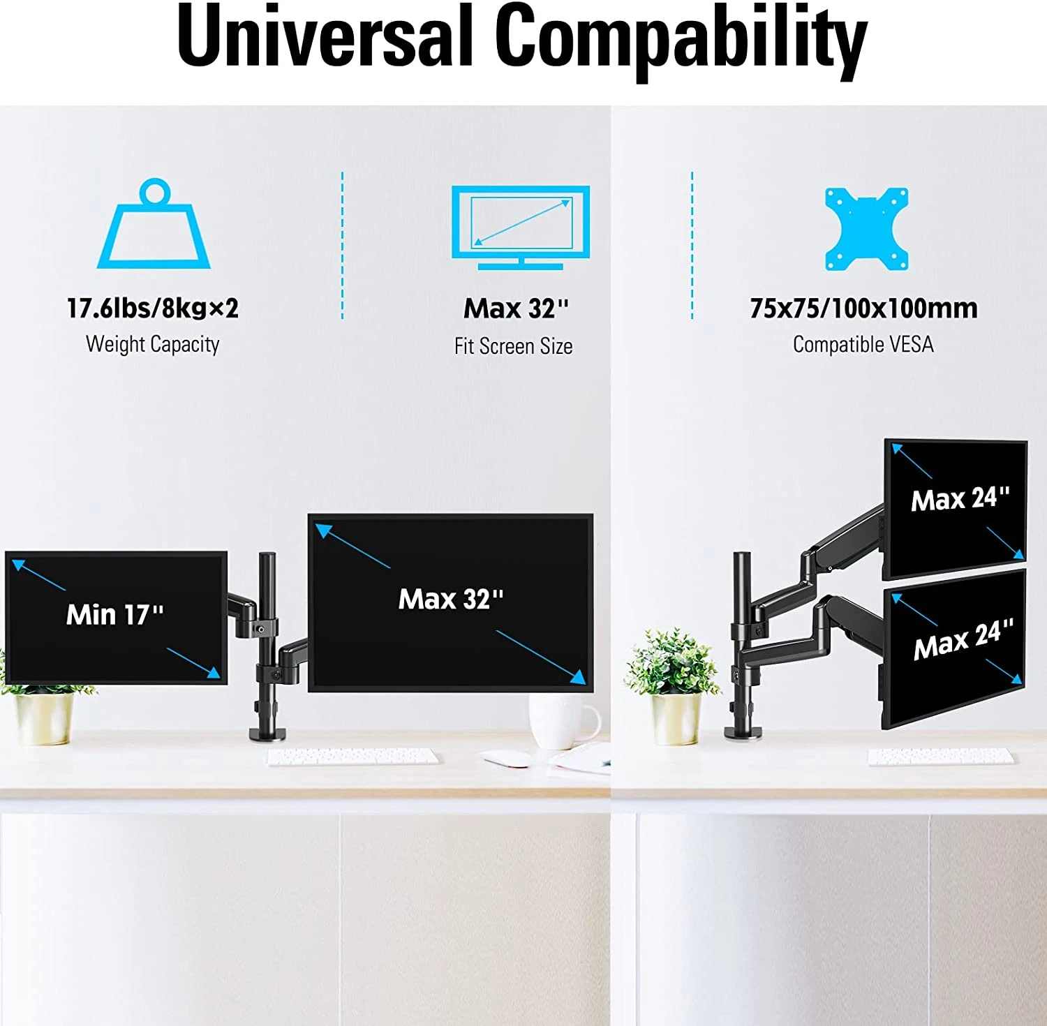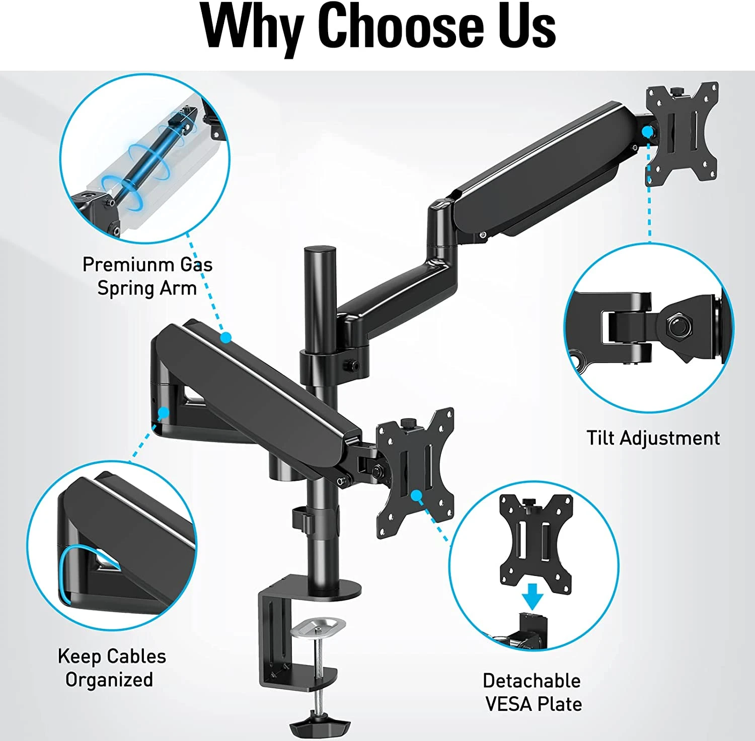 <Gas Spring Height Adjustment>The advanced gas spring system provides 9.4 inches of smooth height adjustment. The dual monitor arm is easy to set an ergonomic height to relieve neck, shoulder or back pain. The height of the arms can be adjusted along the pole for stacking 2 monitors to fit your viewing needs.