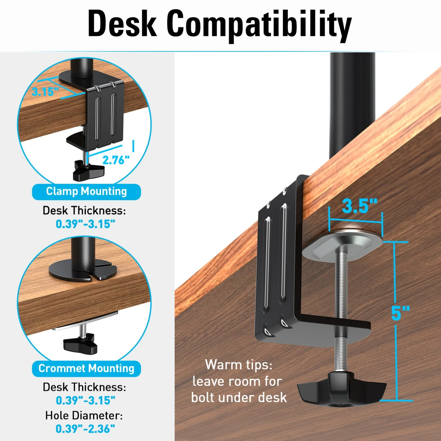 <Fully Adjustable Monitor Mount>The dual monitor mount has a wide range of articulation, rotation, and adjustability for setting a comfortable viewing angle. Full motion adjustable arms can tilt +90°/-45°, swivel +90°/90°, and rotate 360°. Max height is up to 22.6″.