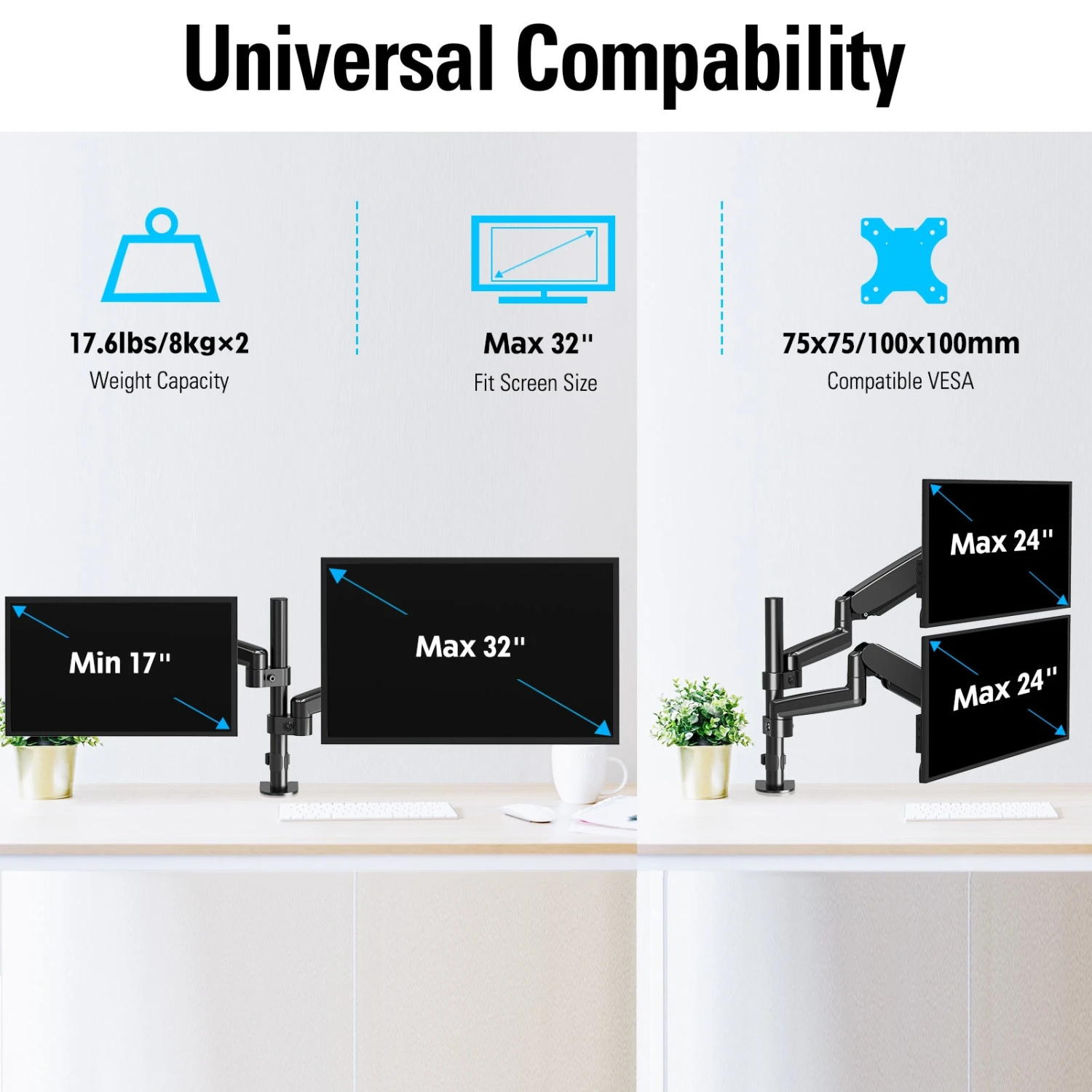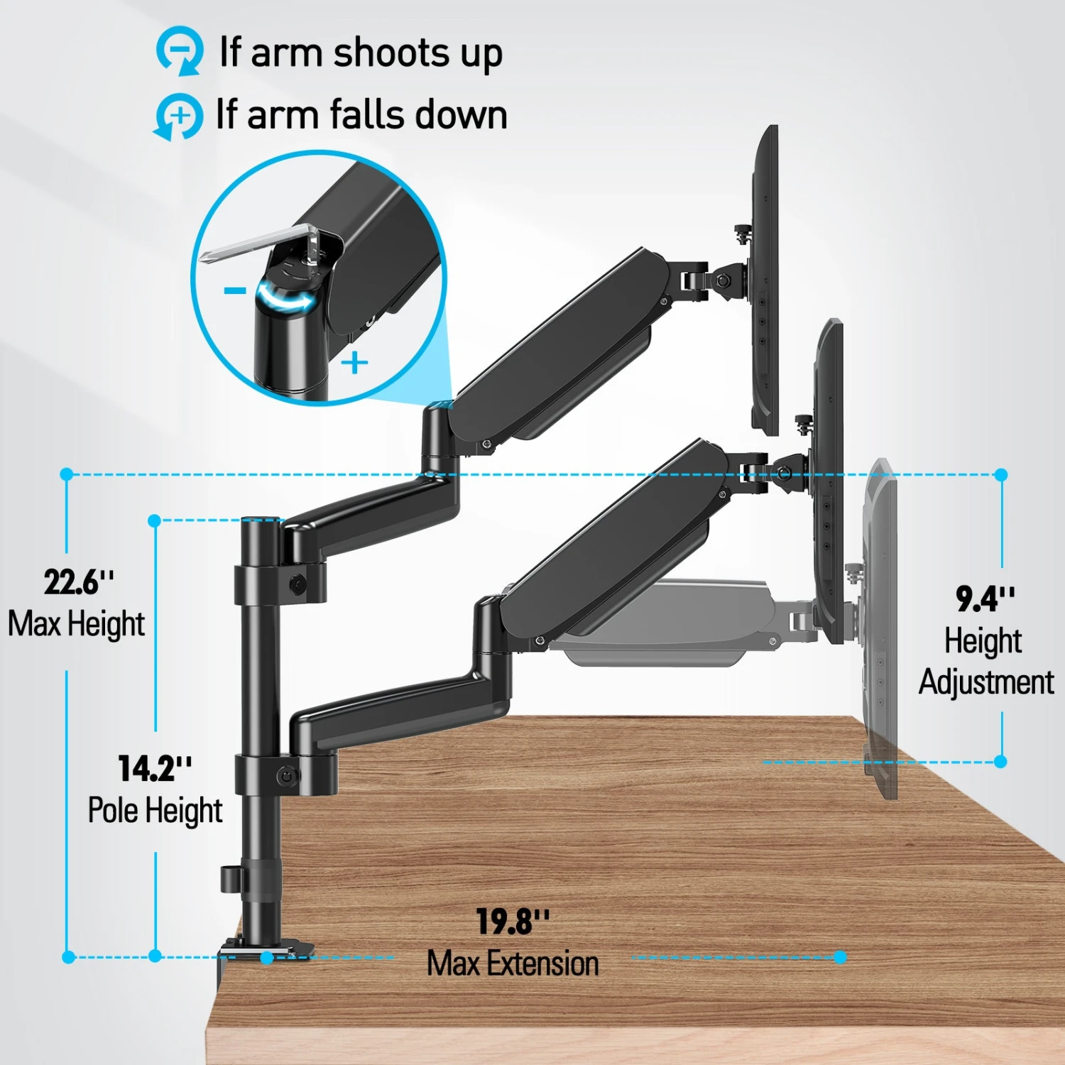 <Gas Spring Height Adjustment>The advanced gas spring system provides 9.4 inches of smooth height adjustment. The dual monitor arm is easy to set an ergonomic height to relieve neck, shoulder or back pain. The height of the arms can be adjusted along the pole for stacking 2 monitors to fit your viewing needs.