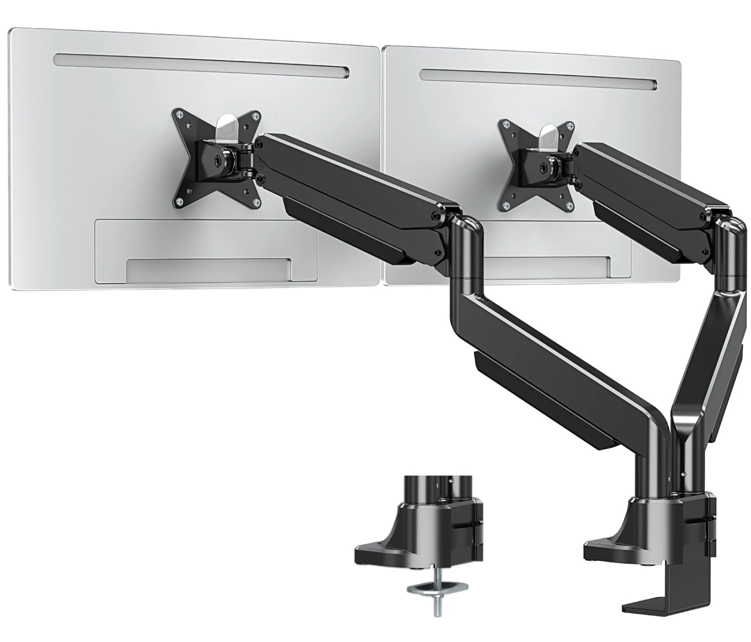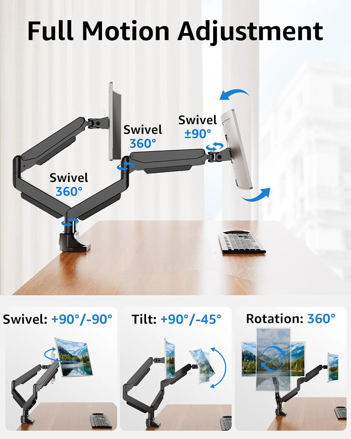 <Full Range Motion-swivel/tilt/rotation>Offer a wider range of movement, the ultra wide double monitor arm allows the screen to tilt up 90°/down 45°, swivel 180°, and rotate 360° from landscape to portrait, stack two max 24” screen monitor. The gas spring arm has a maximum arm extension is 23.58” and a maximum height adjustment is 21.45″ from the work surface. Easily find an optimal ergonomic posture, and relieve strain on the spine, neck, and shoulders.