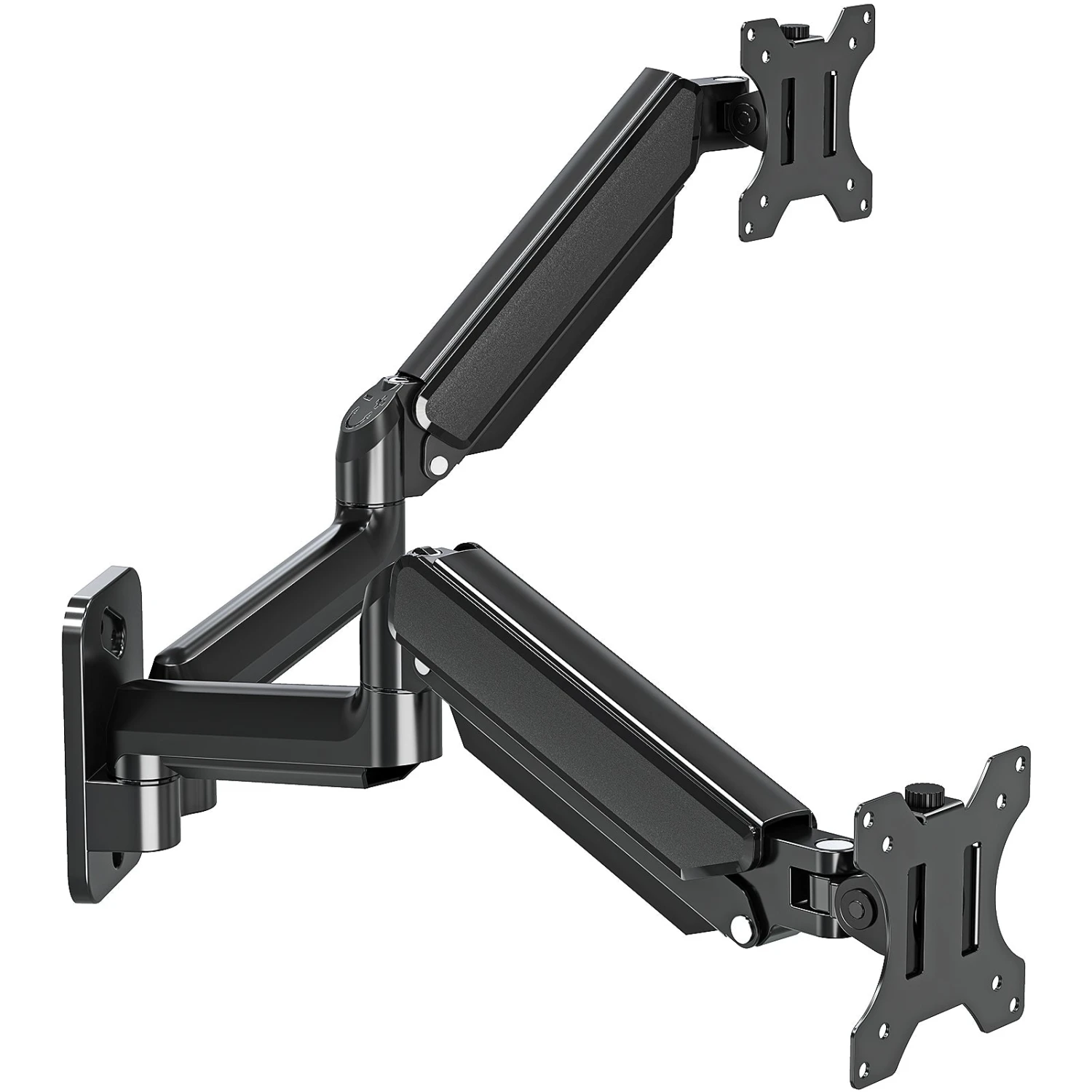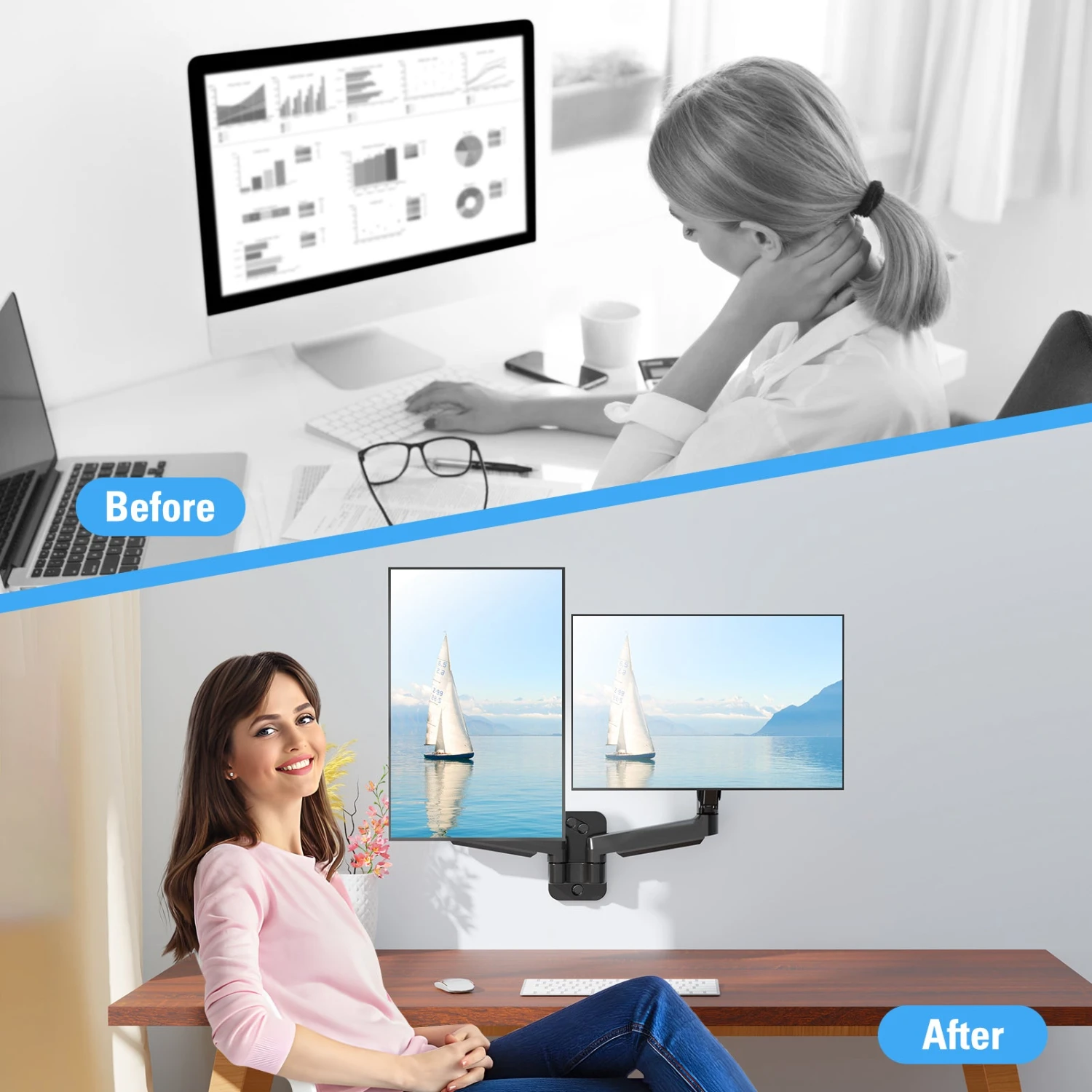 <Free Up Your Workspace>Double monitor wall mount frees up valuable space on your workstation by holding your monitor on the wall. Maximize your workspace and productivity by freeing up desk space and allowing for a range of adaptable positions for your displays. Please do not install into drywall alone