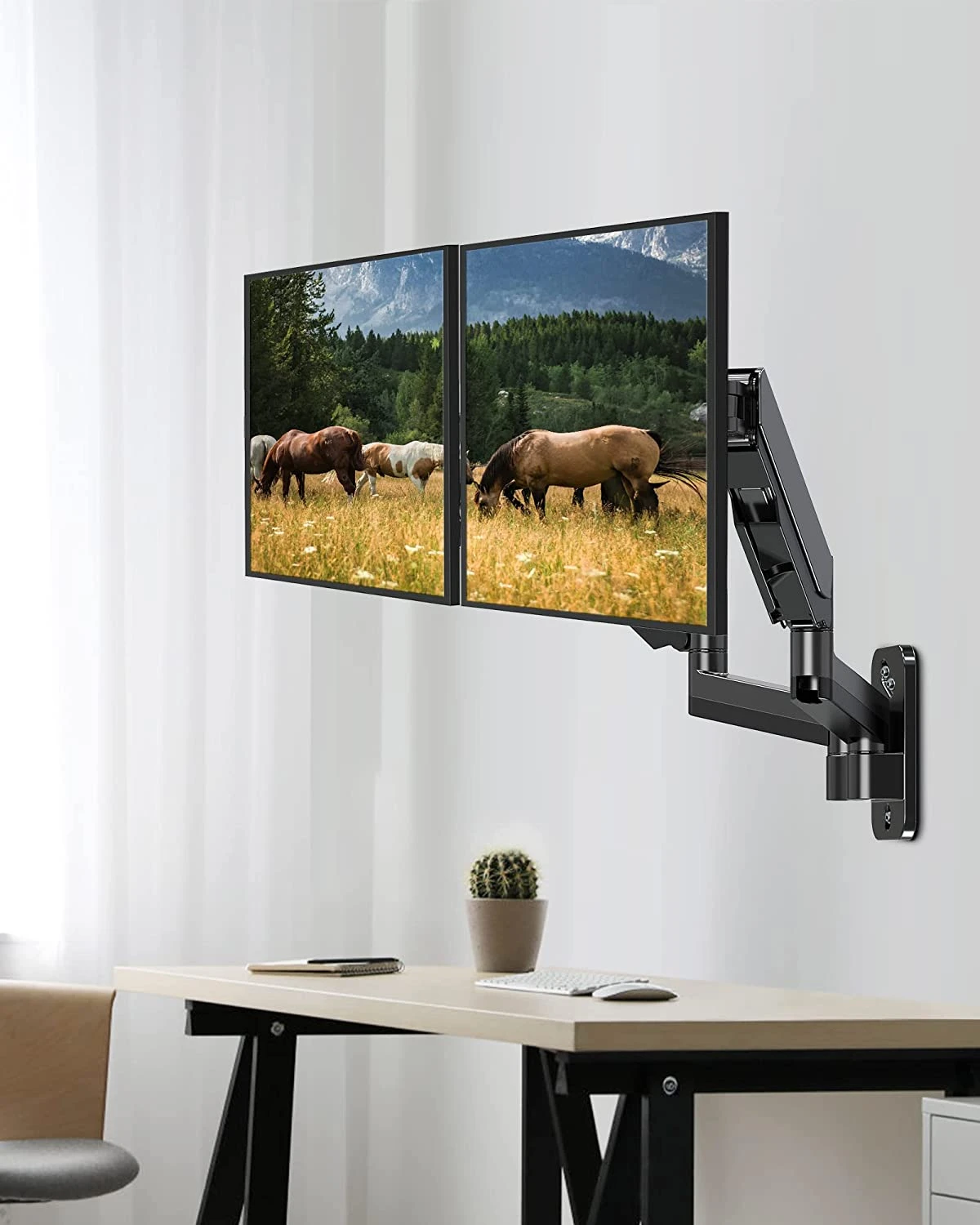 <Transform Your Workstation>Upgrade your office with our Dual Monitor Wall Mount, combining style, comfort, and productivity in one solution. Elevate your work experience today.