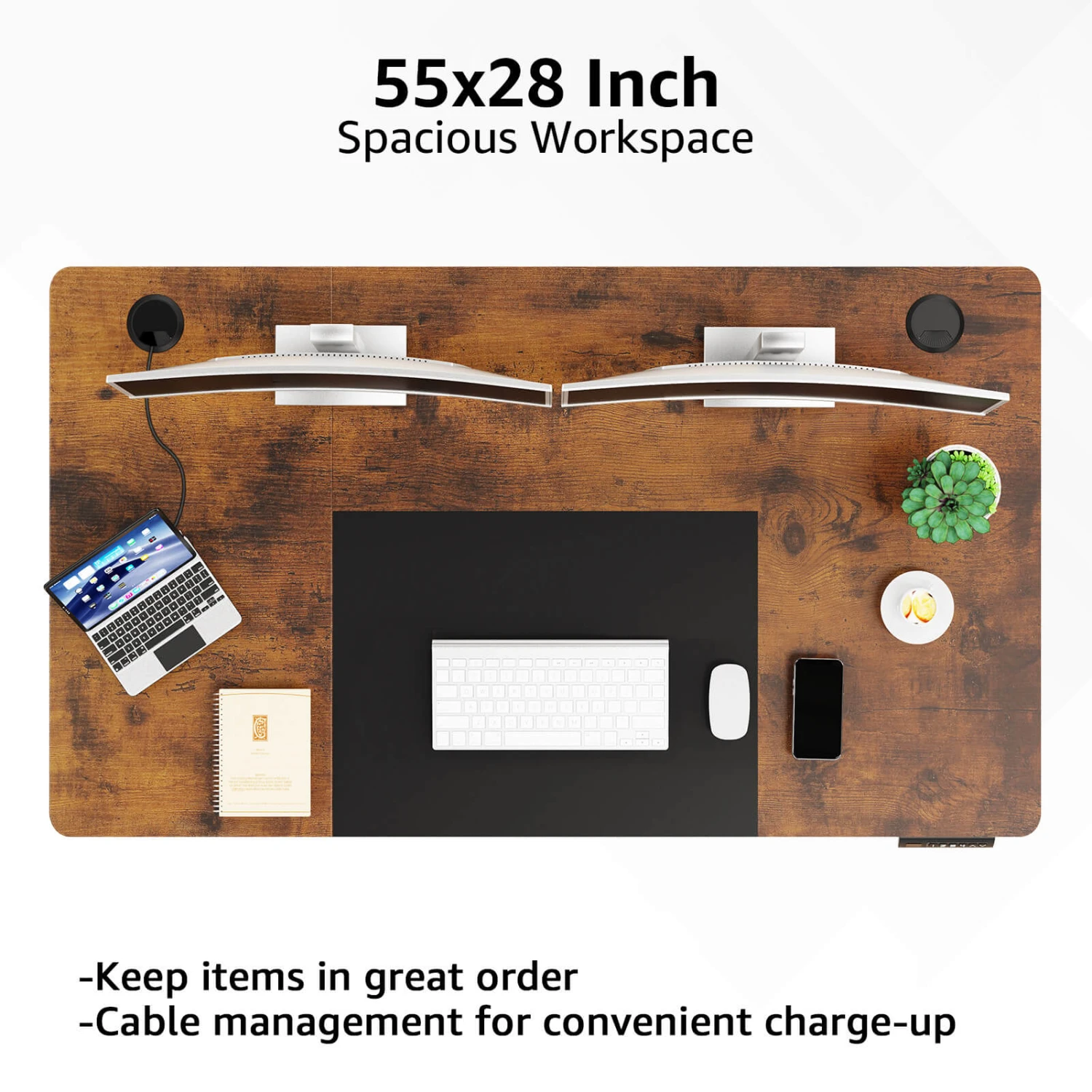 <Spacious Work Area>Large 55 x 28″ eco-friendly desktop offers ample workspace for 2 monitors and laptop setups along with important work materials, supplies, and decor. It provides more space and comfort for your busy working hours.