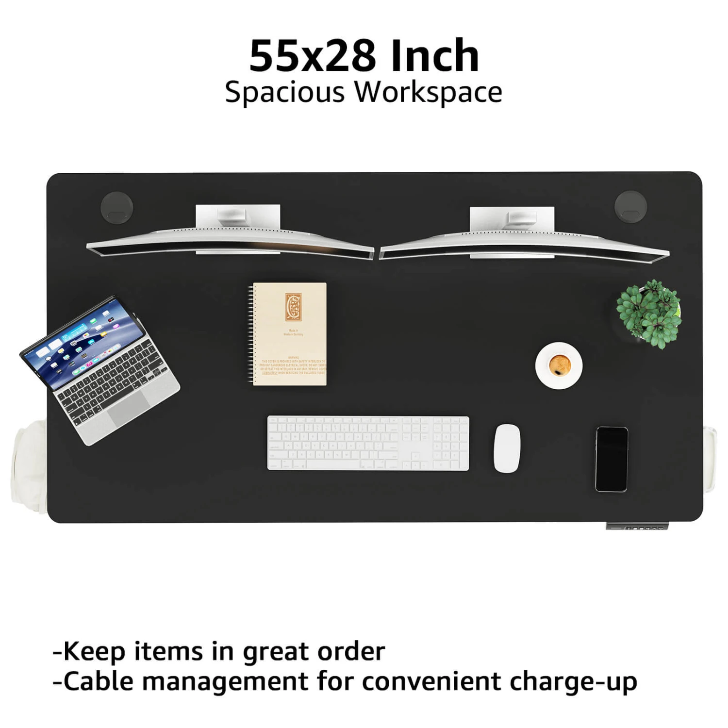 <SpaciousΒ Work Area>Large 55 x 28″ eco-friendly desktop offers ample workspace for 2 monitors and laptop setups along with important work materials, supplies, and decor. It provides more space and comfort for your busy working hours.
