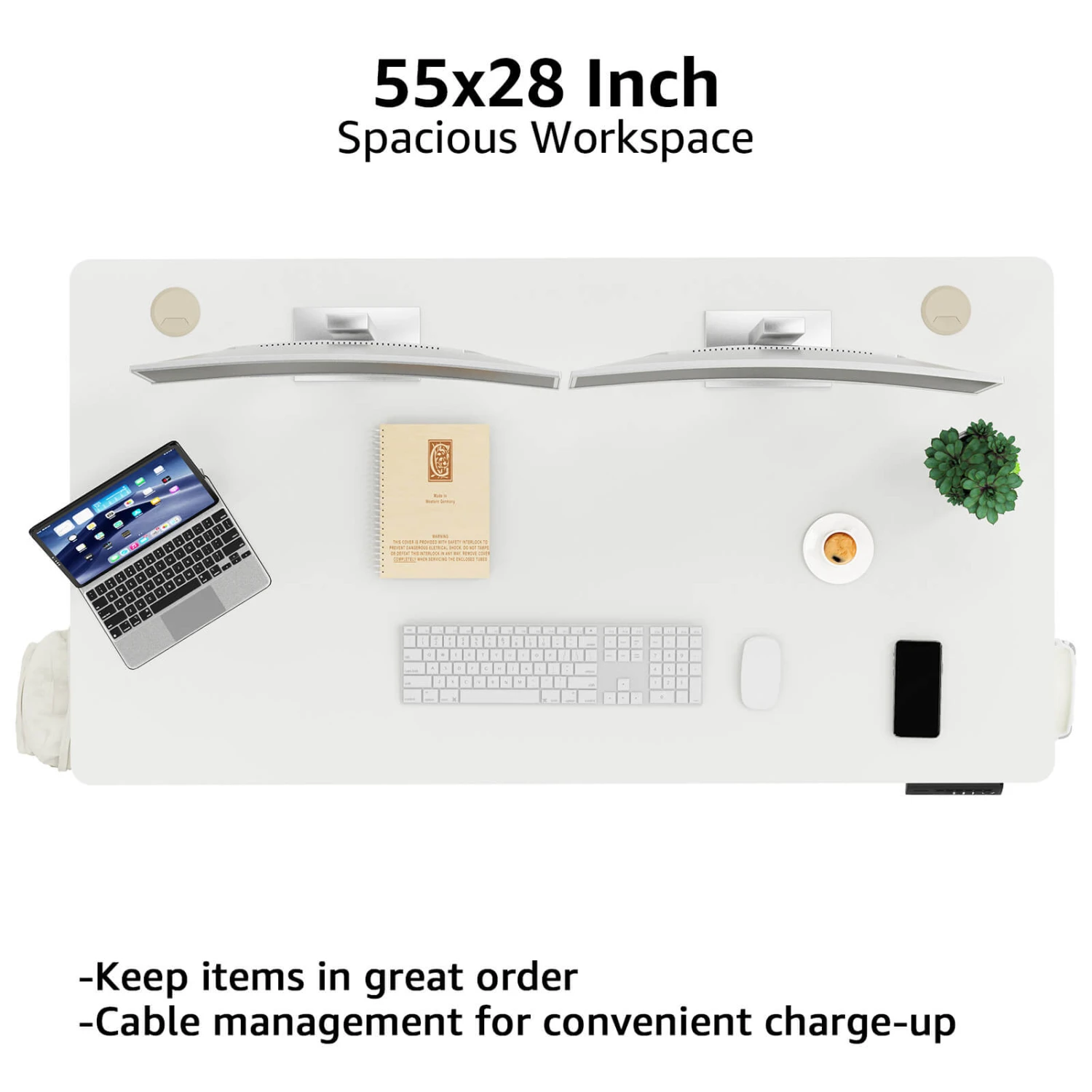 <Spaciousย Work Area>Large 55 x 28″ eco-friendly desktop offers ample workspace for 2 monitors and laptop setups along with important work materials, supplies, and decor. It provides more space and comfort for your busy working hours.