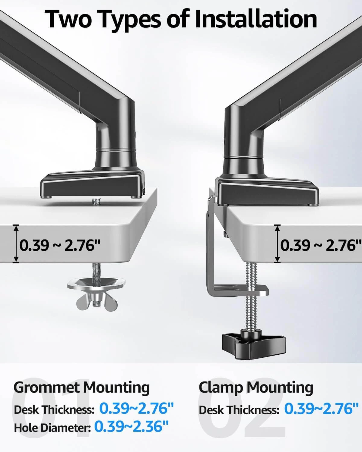 <Two Installation Methods>Easy assembly with the C-clamp or grommet base. Choose C-clamp mounting for desks with 0.39″ to 2.76″ thickness or the grommet mounting fits the desk 0.39″ – 2.76″ thickness with a bolt-through hole 0.39″ – 2.36″. Either way, installation is easy thanks to the included instructions and hardware.