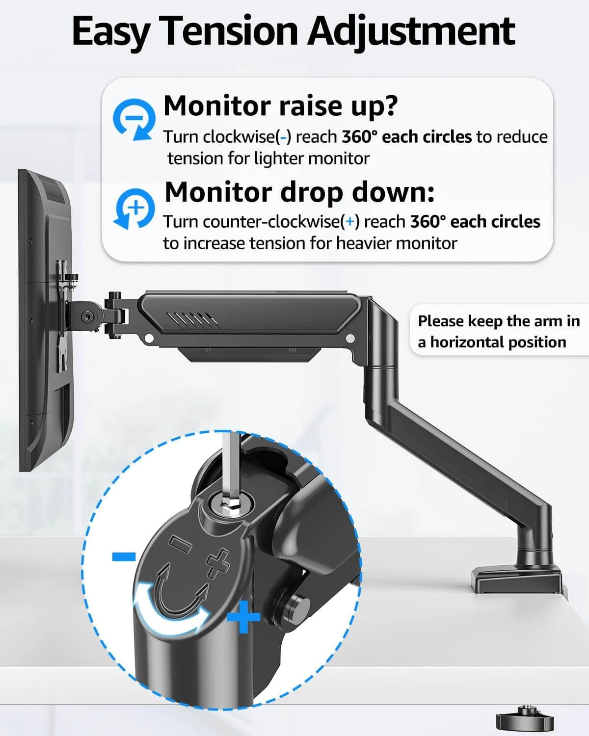 <Full Motion Monitor Stand>Our monitor mount allows the screen to tilt up 70° down -45°, swivel 180°, and rotate 360° from landscape to portrait. Each connection of the arm is adjustable. You’ll be able to set your screens where you want it. You will not bend your neck to watch the screeen mounting on Freelift any more, which can reduce strain on your neck, shoulder, and back.