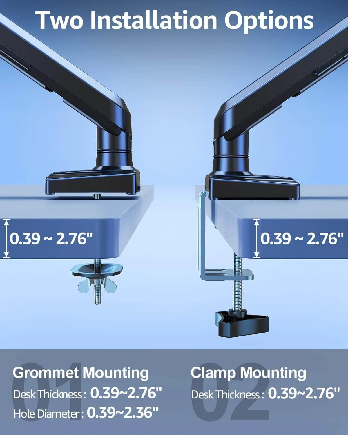 <Two Installation Methods>This monitor stand for desk comes with both C-clamp and grommet base. Choose C-clamp mounting for desks with 0.39″ to 2.76″ thickness or the grommet mounting fits the desk 0.39″ – 2.76″ thickness with a bolt-through hole 0.39″ – 2.36″. If the thickness of your desk is not within this range, please relate with us for suitable C-clamp.