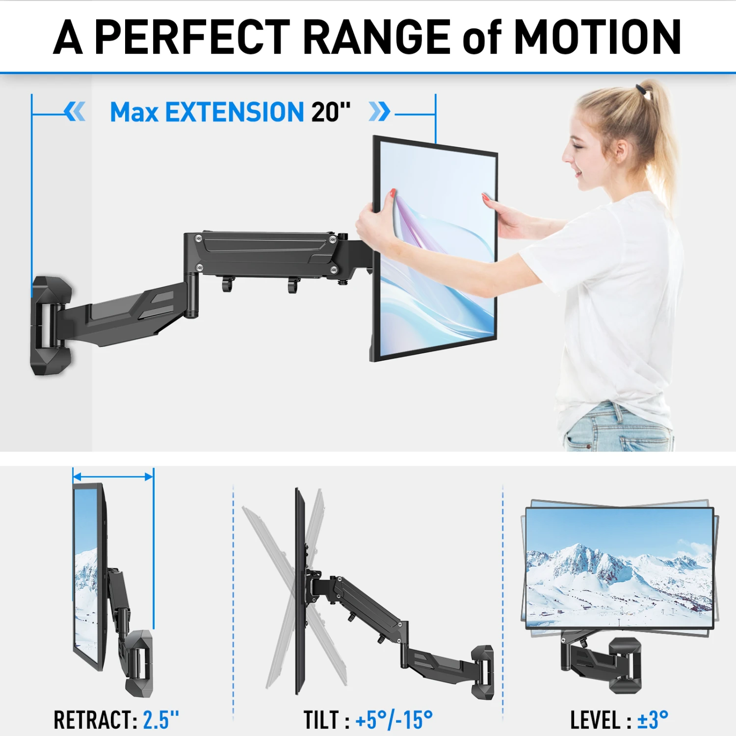 <Fully Adjustable TV Wall Mount>With a super strong pneumatic gas spring, this TV mount provides 12โ of height adjustment for maximum flexibility(adjusts to the weight of the TV). Moving your TV screen up or down easily reduces strain on your neck and back for a more comfortable viewing experience.