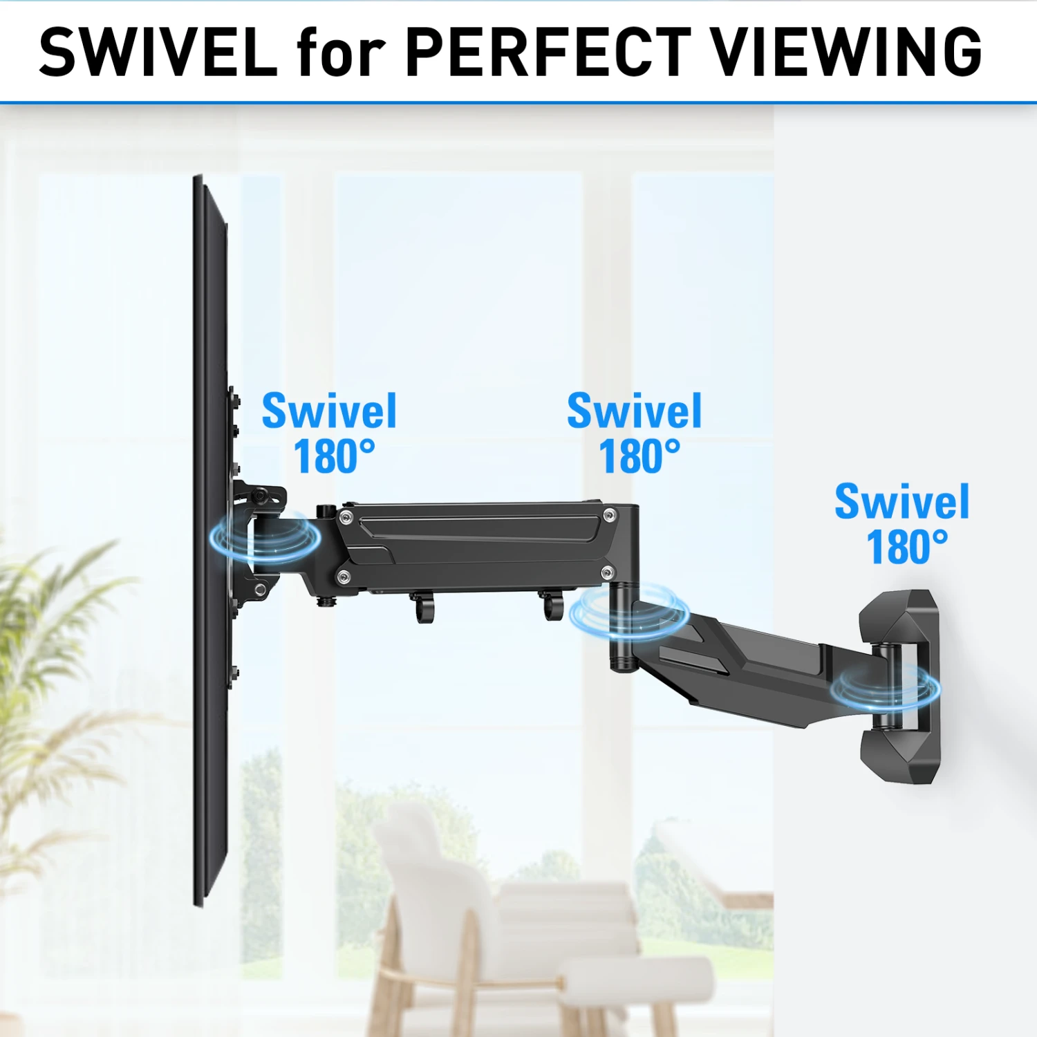 <Provides Perfect Viewing Angles>With a Tool-free tilting design, the TV mount can easily tilt flat or curved screen +5ยบ/-10ยบ to reduce glare. A 180ยฐswivel and a smooth 23″ extension can make you enjoy the television everywhere at an ergonomic sitting position.
