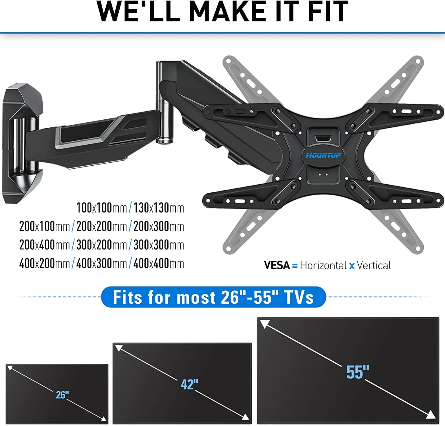 <TV Wall Mount Compatibility>The full motion TV brackets fits most 26-55 inch LED/LCD TVs and large monitors, with 11- 44lbs. MAX loading and VESA pattern from 100x100mm to 400x400mm. This articulating television wall mount is designed for single wood studs or concrete/brick walls and is compatible with TCL, SAMSUNG, LG, VIZIO, SONY, HISENSE, and other TV brands.