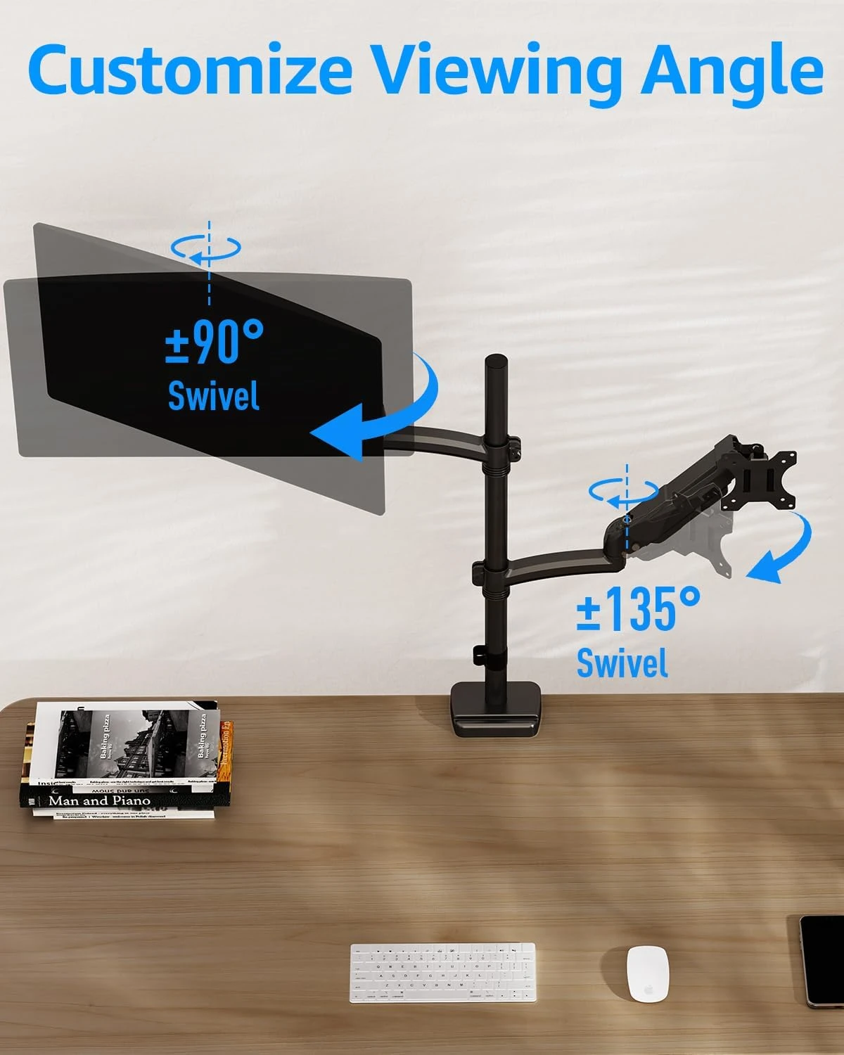 <Customize Your Screen Angle>This full motion dual stacked monitor mount allows your monitor ยฑ90ยฐtilt, 180ยฐswivel and 360ยฐrotate to find an optimal view angle to meet your demands.
