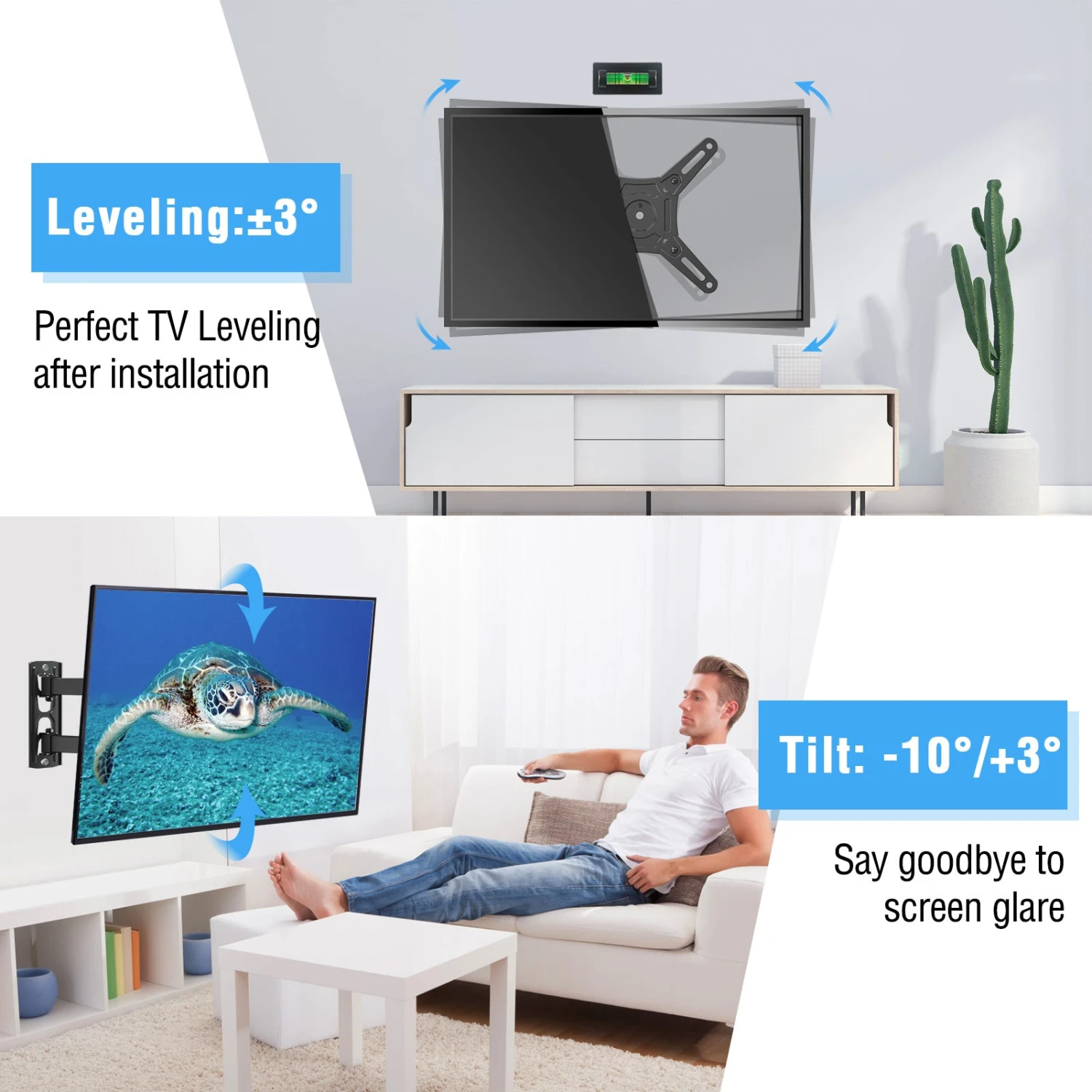 <Adjustable for Max Flexibility>This TV wall mount bracket can tilt TV +3ยบ/-10ยบ to reduce glare, level +/-3ยบ after installation for maximum viewing flexibility. The strong articulating arm provides a smooth 14.96″ extension and 2.67″ depth to the wall for saving space.