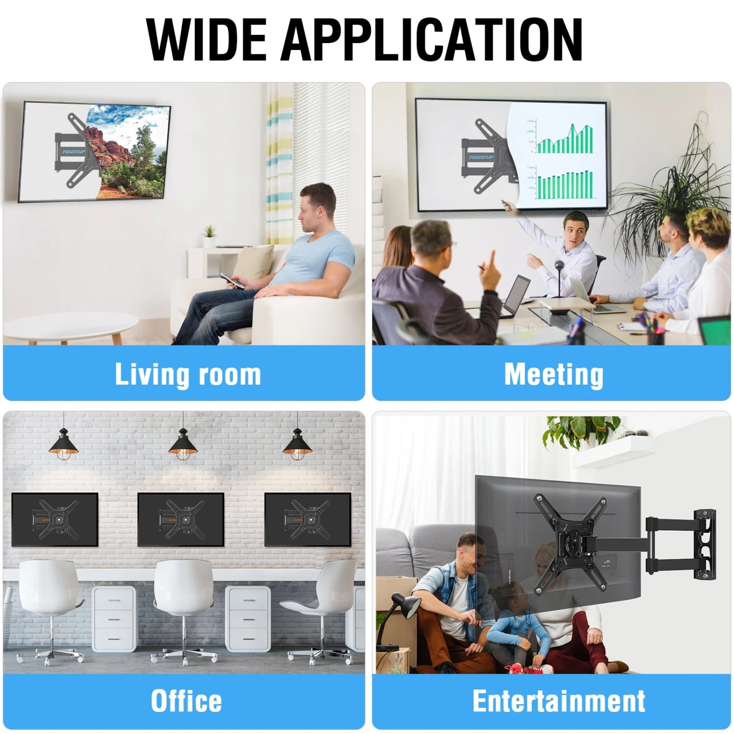 180ยบ Rotation & Swivel Design – With the 180ยบ rotation unique design, the full motion TV mount can easily display in landscape or portrait position to meet your special need. Also, this swivel TV mount can swivel TV 180ยบ to cover any angles in your home for the ultimate viewing experience.