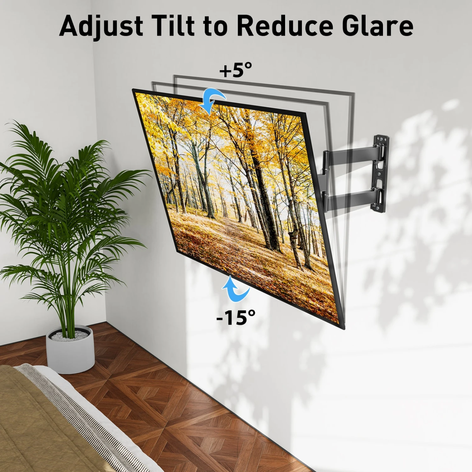 <Optimize Viewing Experience>The single stud swivel design is great for wall corners. It gives you the maximum flexibility in positioning your TV to fit your environment for a comfortable view. The mount can swivel left or right 90°, tilts up 5°, tilts down 15°, and has +3°/-3° screen level adjustment capability.