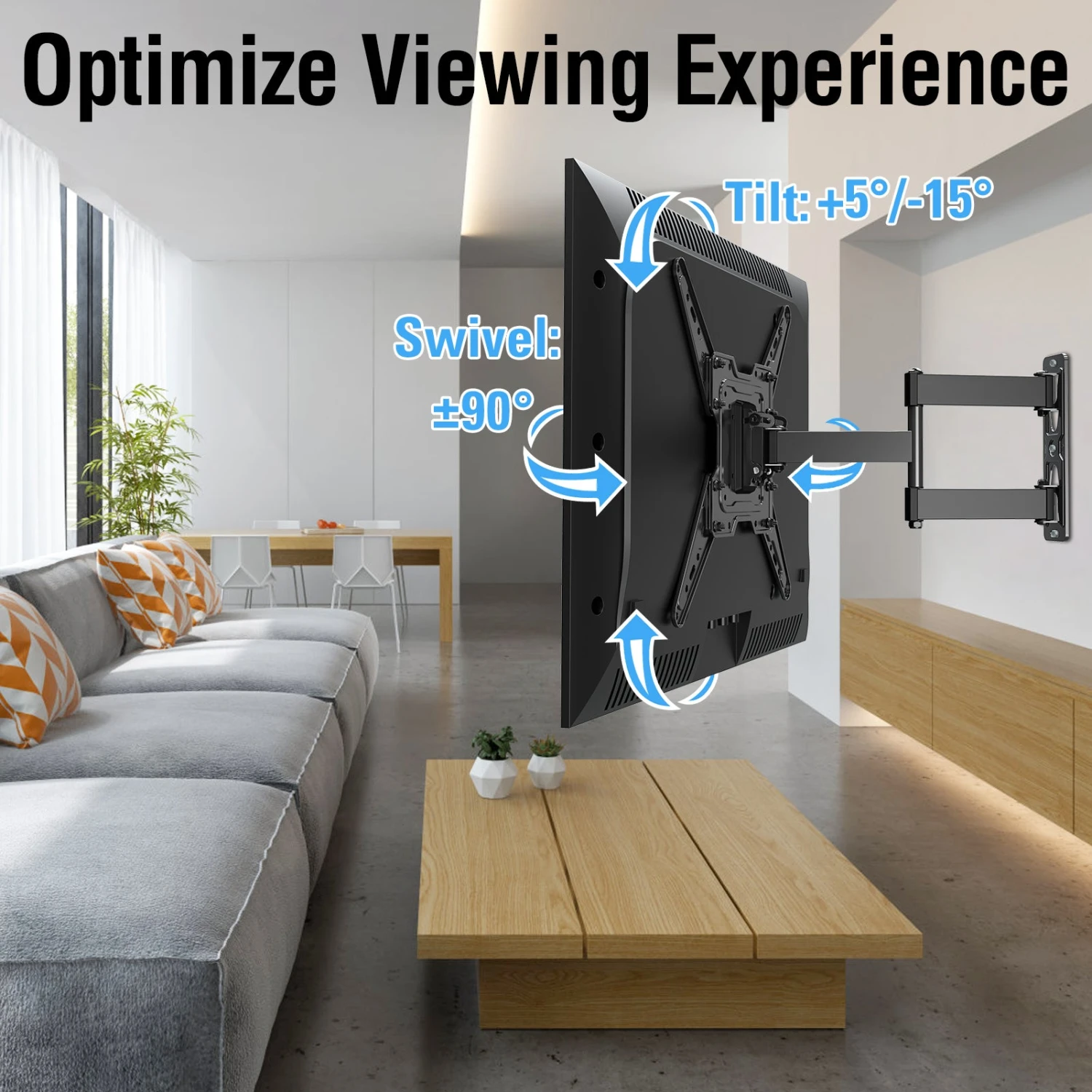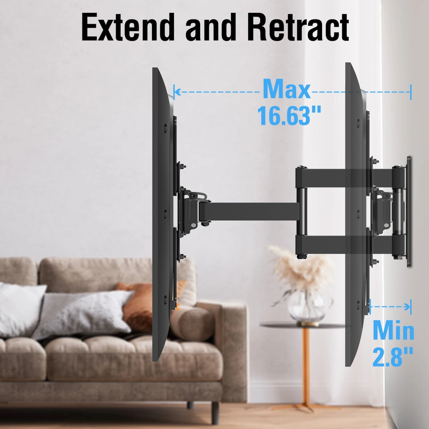 <Full Motion for Customized Viewing Angle>The articulating TV mount allows +/-90°swivel (max. swivel angle depends on TV size) to provide full-motion adjustment capacity for ideal viewing. You can tilt angle ranging from +5°to -15°to reduce glare from lights and extends up 16.63” to get more comforts from any seat in the room, and +/-3°level adjust for maximum viewing flexibility, no more neck or back pain !