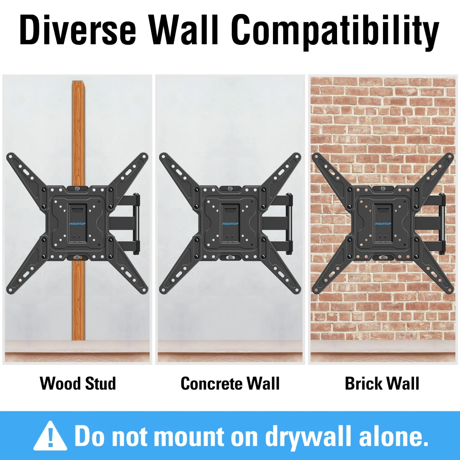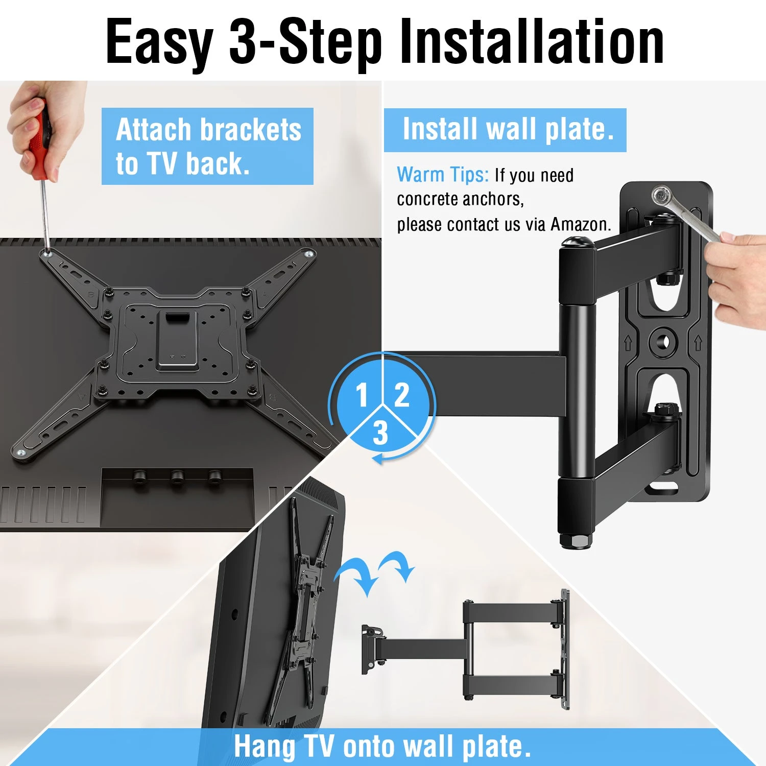<Easy and Quick Installation>Our swivel and tilt TV Mount is easy to install and comes with a clear step-by-step installation instruction, bubble level, and necessary standard mounting kit. The concrete wall anchors will be sent per request(Please contact us through your order). NOTE: DO NOT install into drywall alone.