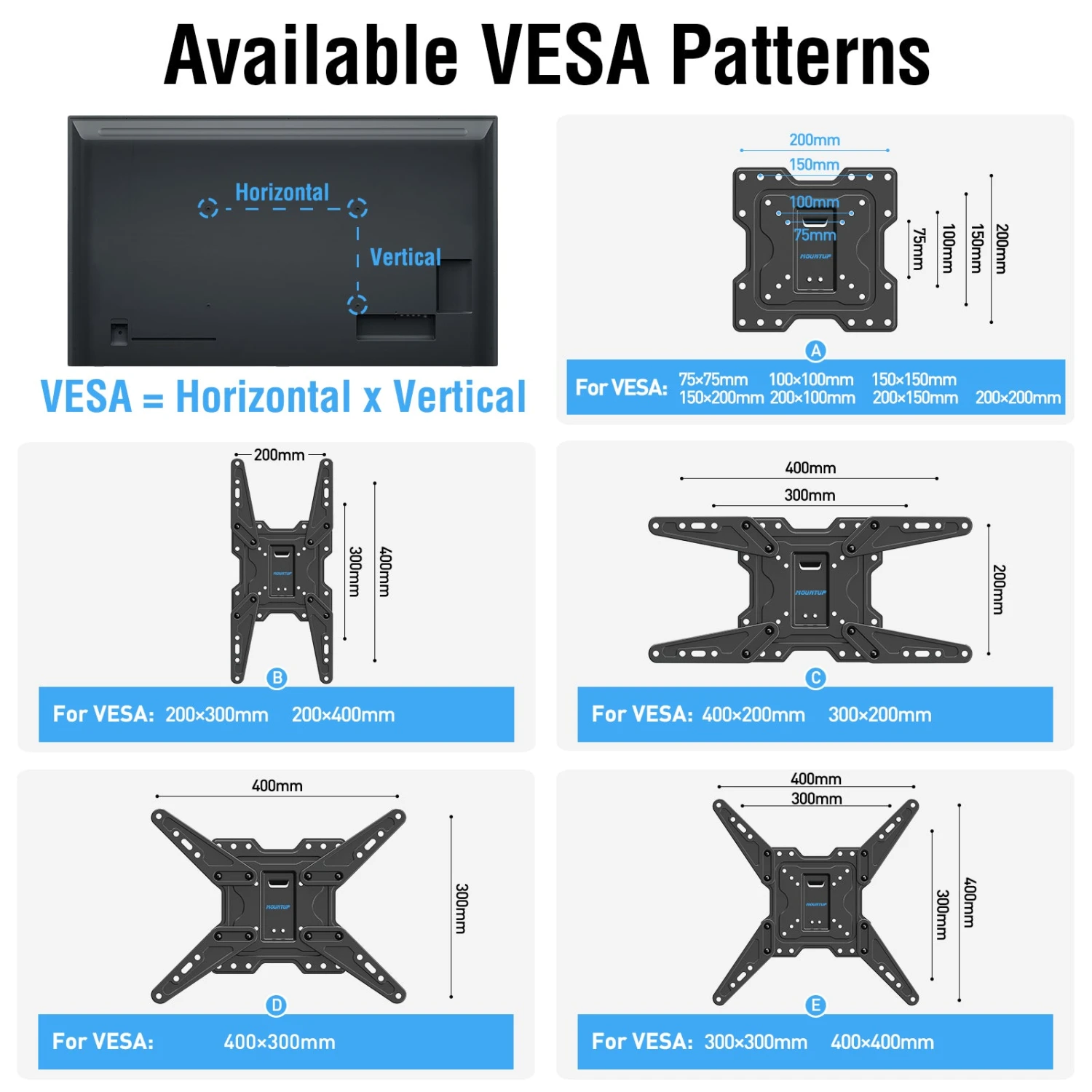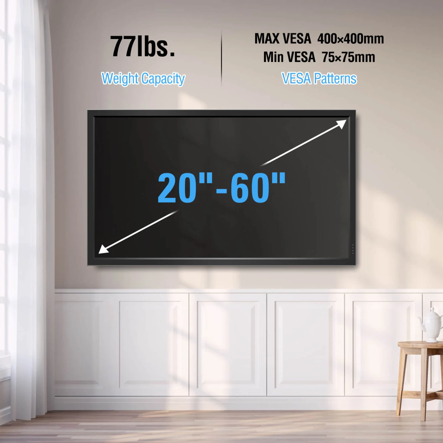 <Universal TV Mount>This full motion TV mount fits most 20-60 inch TVs with VESA patterns range from 75x75mm(3×3”) to 400x400mm(16×16”) and holds up to 77 lbs./35kg. Please CHECK TV weight, size, VESA, and input access before purchase.