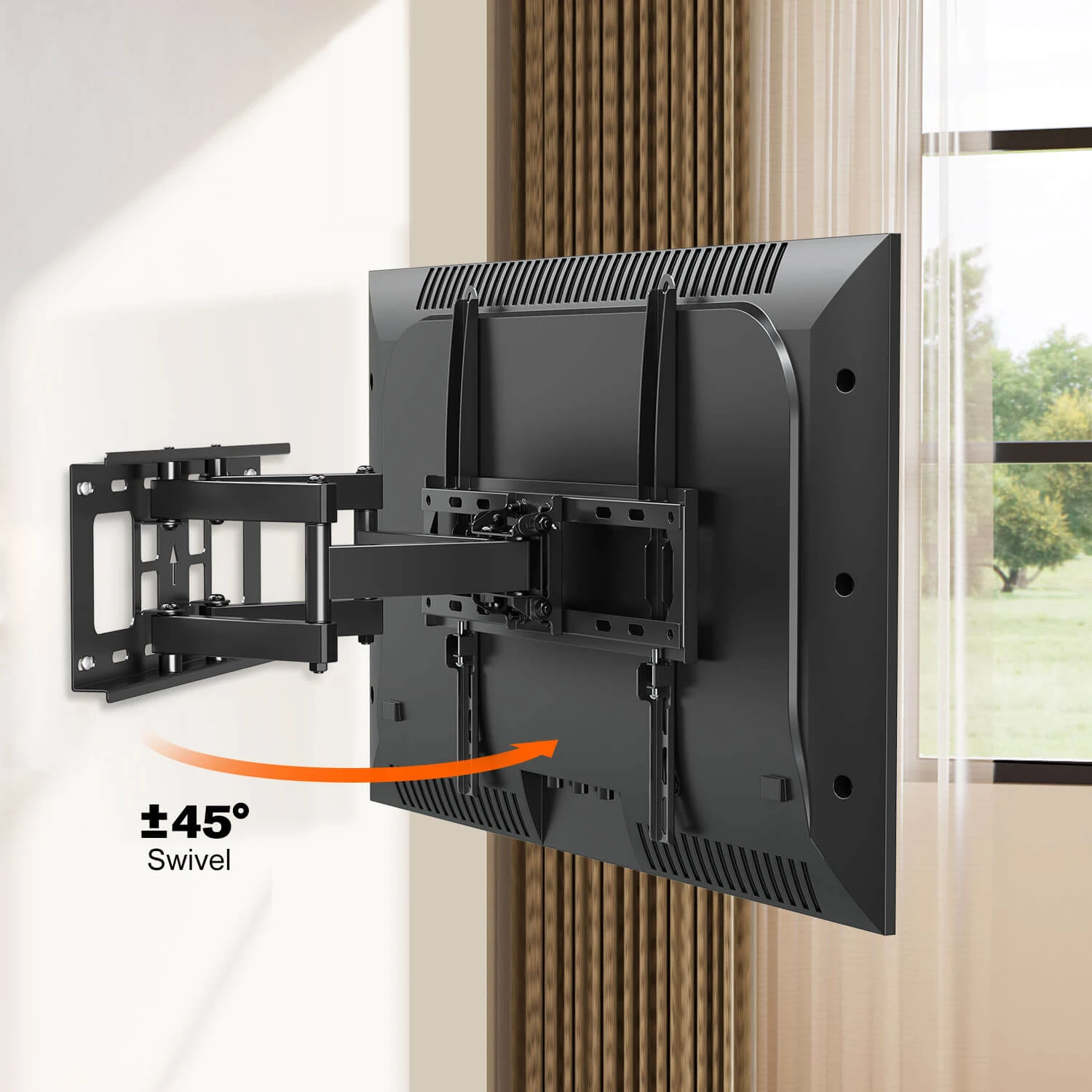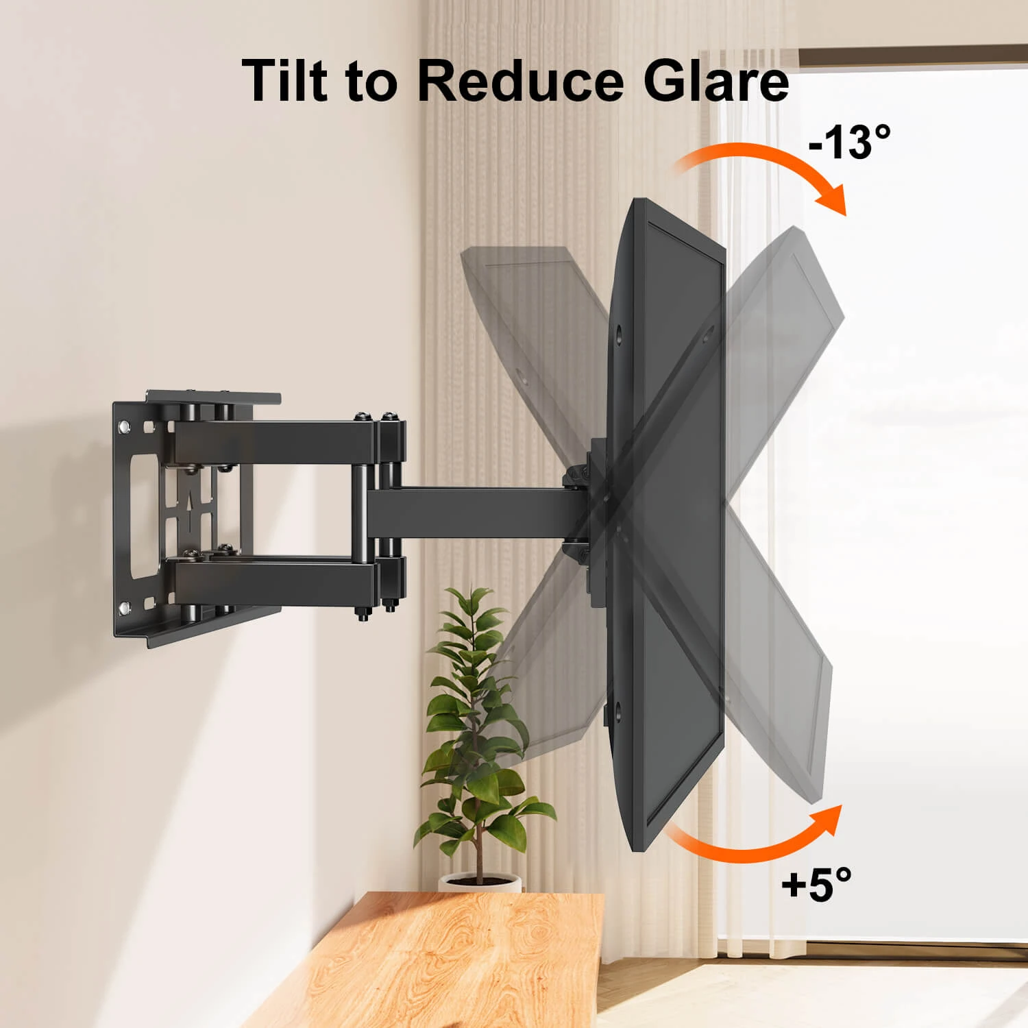 <Full motion TV wall mount>With a 15.6” extension, this full motion TV mount is able to swivel the TV 45ยฐ left or right. The TV can follow your sight and position in the room. 13ยฐ of tilt capability makes reducing glare easily. Tilt the TV down to eliminate glare from reflective light and tilt the TV up for easy cable management. When the TV is not in use, it can be retracted 2.9” back to the wallย to create a sleek look.