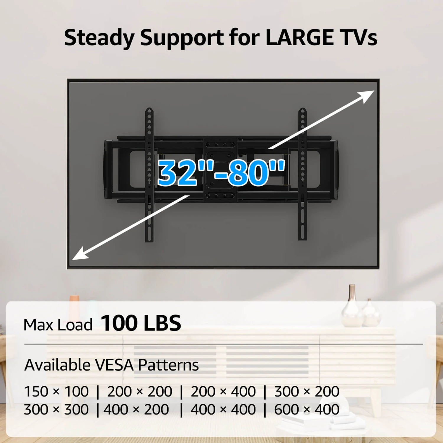 <Universal TV Wall Mount>This wall mount fits most 37,42,46,50,55,60,65,70,75 80 inch TVs with VESA from 150x100mm to 600x400mm up to 100 lbs./45kg, fitting 24″ wood studs spacing.