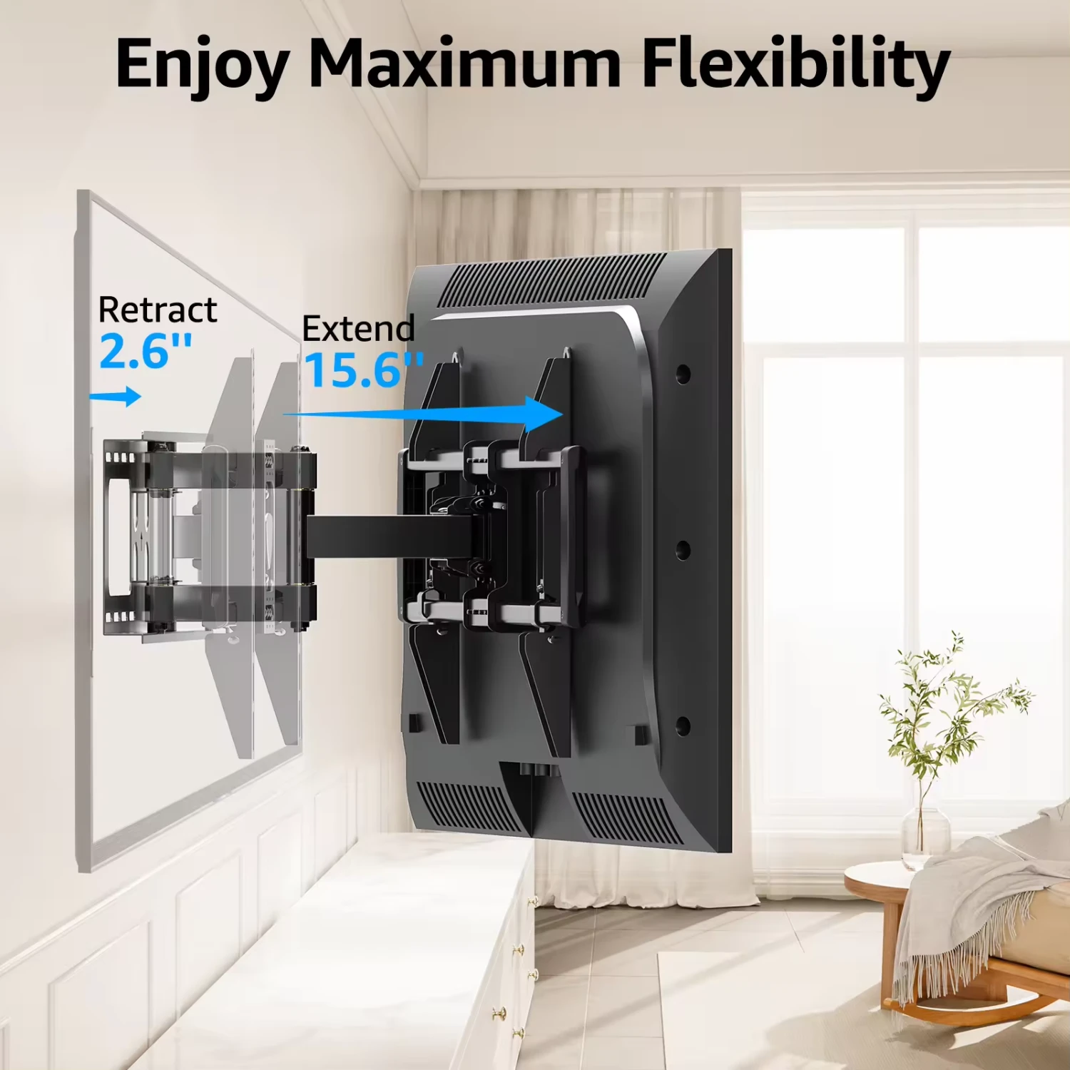 <Solid as A Tank>TV wall mount designed with 6 articulating arms extend up to 15.7″ and retracts back to 2.46″ for maximum flexibility. Heavy duty TV wall bracket made of cold-formed steel ensures strength and is reliable for the TV and your families.