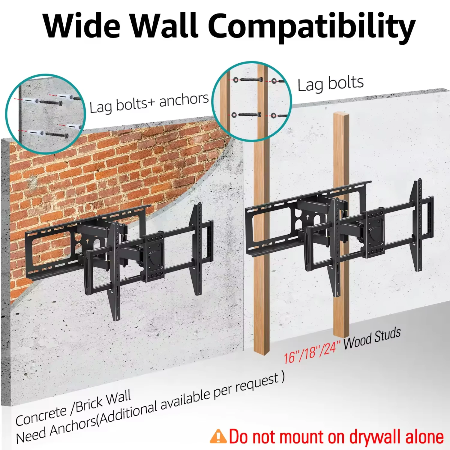 <Quick & Easy to Install>Our wall mount TV bracket comes with step-by-step manual, bubble level and necessary hardware to help complete the installation. Concrete anchors will be sent per request. DO NOT install into drywall alone!