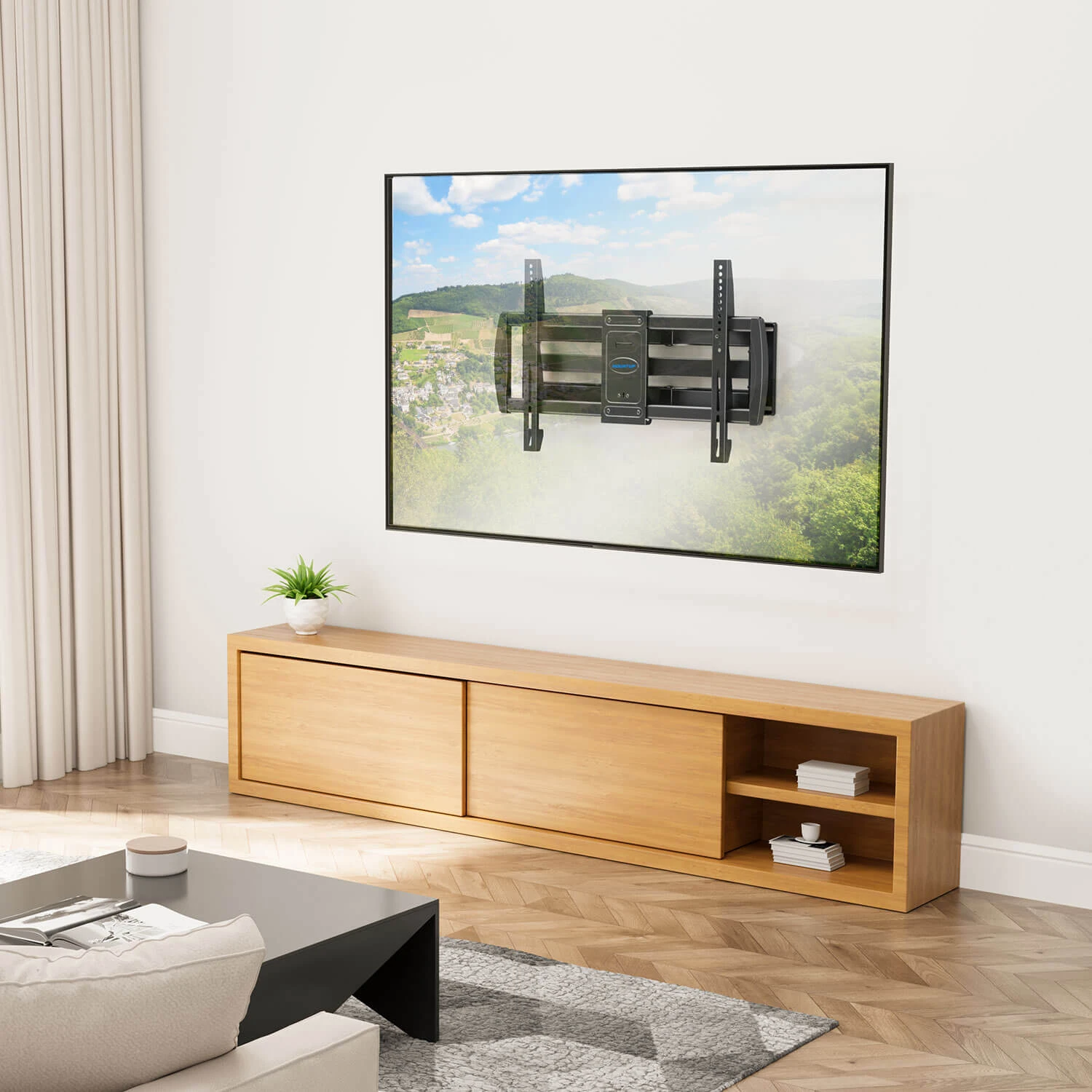 <Full motion TV wall mount>This Articulating wall mount can easily swivel 45ยฐleft or right at different seat positions, tilt 5ยฐup and 10ยฐ down for reducing screen glare, and allow +/- 3ยฐ adjustment after mounting for perfect screen leveling. The 86 inch tv wall mount extends 24″ to bring your TV closer for more comfortable viewing and retracts back 2.9″ for smooth movement and space-saving.
