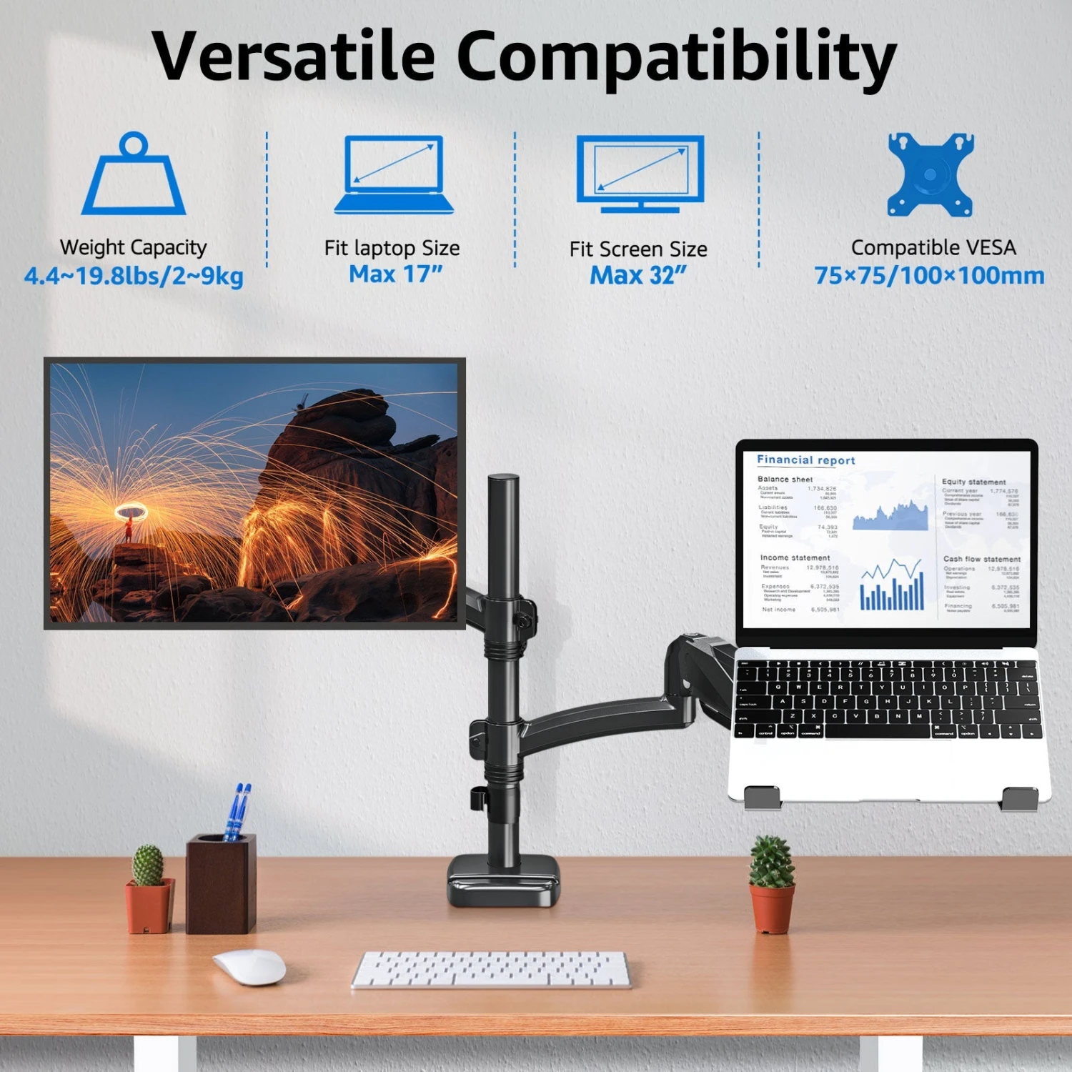 <Monitor Stand for Desk>Hold one up to 32″ monitor and one 13″-17″ laptop. Each arm can hold 4.4-19.8lbs laptop or monitor with 75mm x75mm or 100mm x 100mm VESA mounting holes.