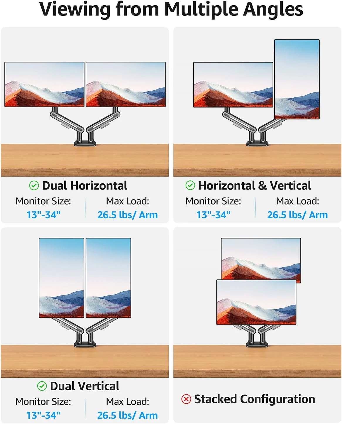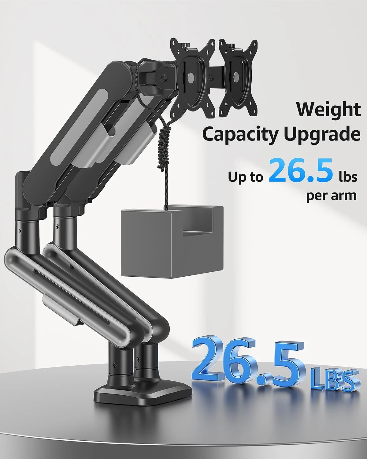 - Supports Serious Screens – The monitor arm handles monitors up to 26.5 lbs and fits screen sizes from 17″ to 39″, with VESA 75x75mm and 100x100mm compatibility. Whether it’s an ultra-wide for spreadsheets or a 4K display for gaming, this dual monitor mount lifts with ease and stays rock-solid.