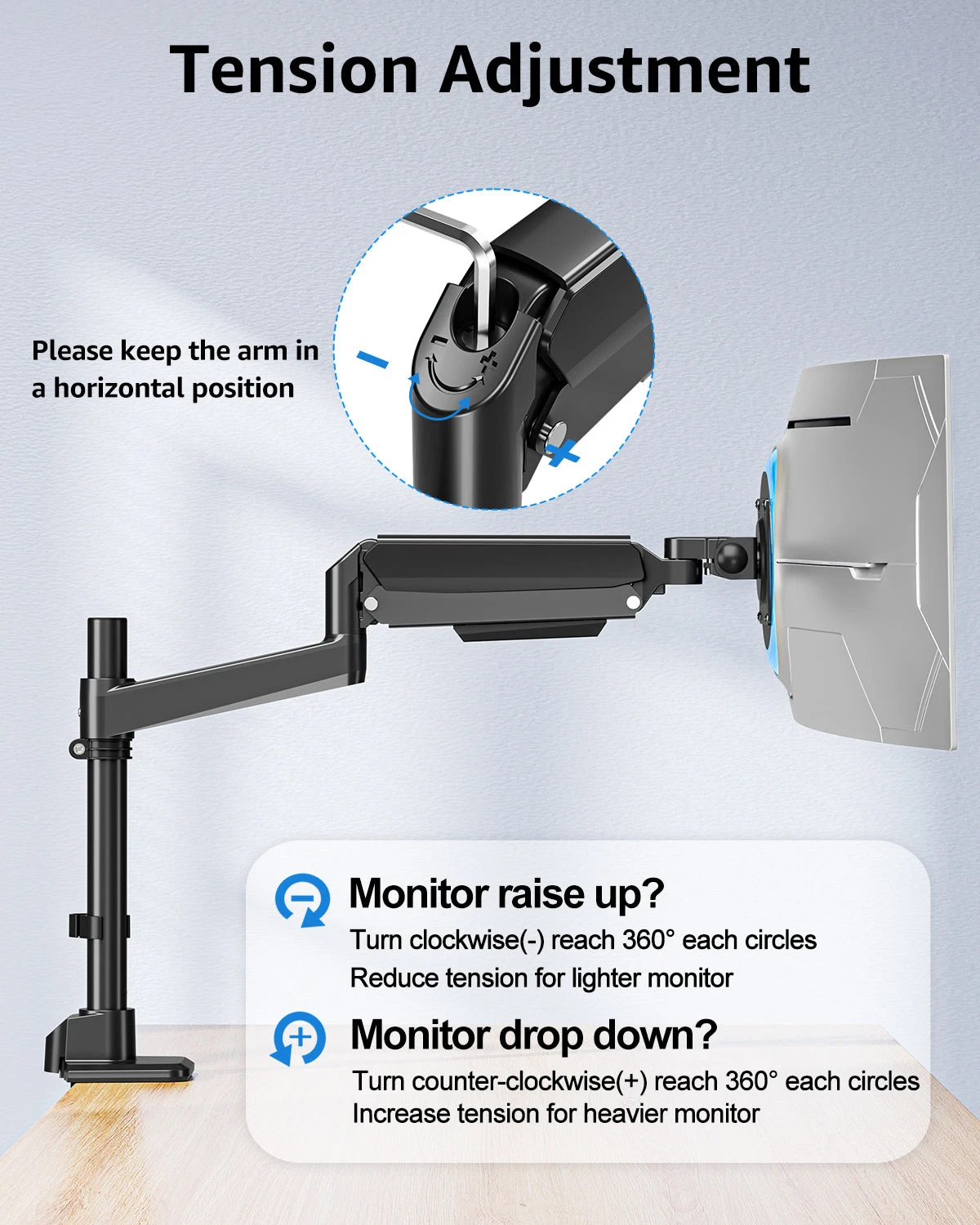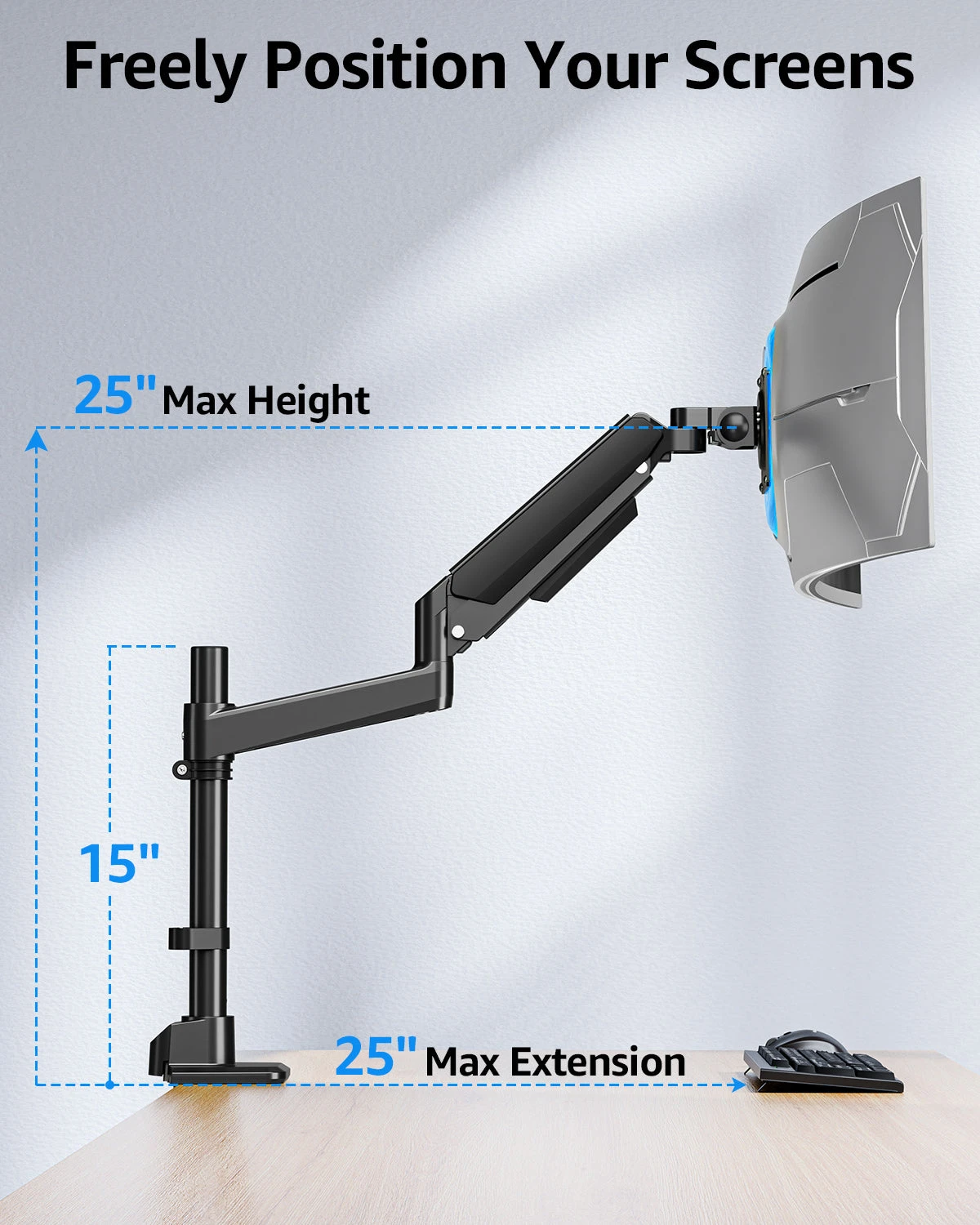 - Full Motion Heavy Duty Monitor Arm: Tilt, swivel, or rotate your screen exactly how you want. With +90°/-45° tilt, ±90° swivel, and full 360° rotation, you can easily switch from coding in landscape to gaming in portrait. The pole is 15″. The arm can extend up to 25″ long, and rise up to 25″ height, giving you the freedom to pull your screen closer or push it away with ease. The monitor arm lets you raise or lower your monitor for perfect ergonomics. Say goodbye to neck strain during marathon work sessions or Netflix binges.