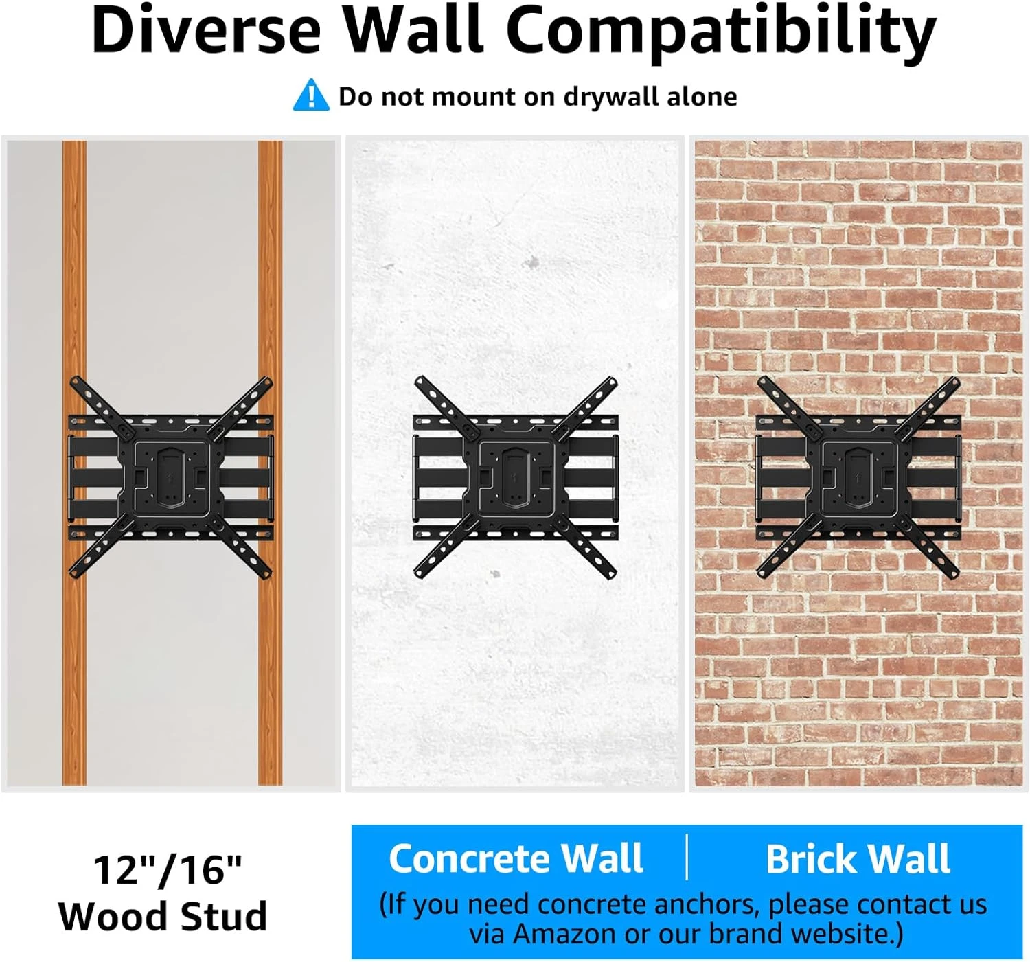 <Universal Matching>This TV Wall Bracket is compatible with most 26″-75″ flat TVs up to 88lbs. Fits VESA from 75x75mm to 400x400mm mounting patterns. And it fits a wood stud spacing from 8 inches to 16 inches. It could be mounted on wood studs, concrete walls and brick walls. NOT FOR DRYWALLS ALONE. Search MU0060 for drywall tv mount.