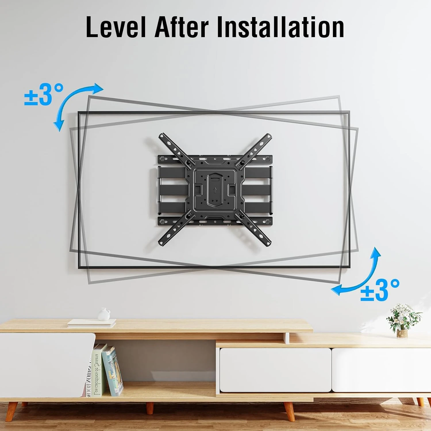 <Full Motion>The TV wall mount features a 10° tilting angle, which allows you to adjust the screen down to where with less glare and best viewing sense to reduce neck and eyes strain. It extends 14 inches longest from wall, with a 45° of left and right swivel angle and a 3° levelng adjustment. Please note that max swivel angel depends on TV size.