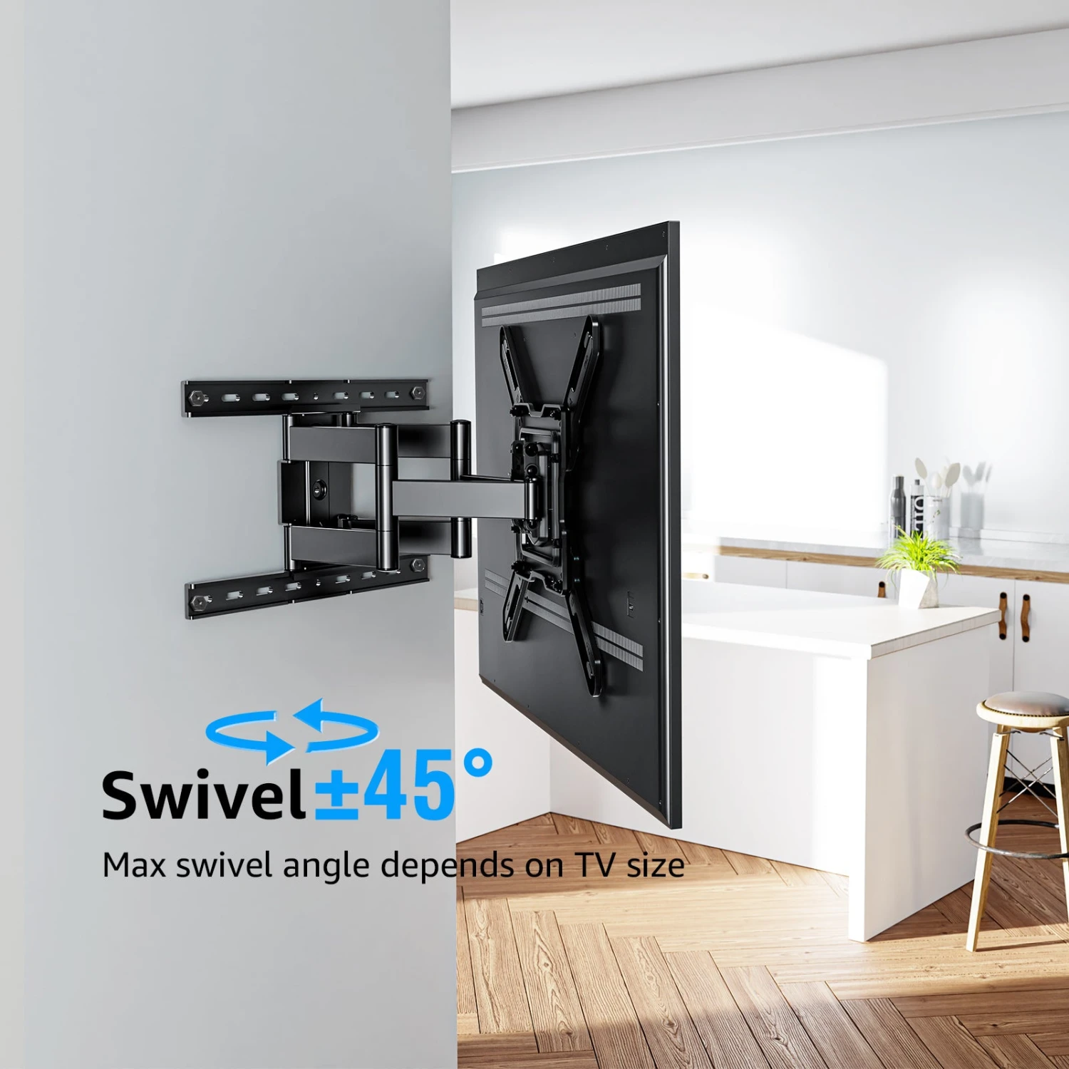 <Full Motion>The TV wall mount features a 10° tilting angle, which allows you to adjust the screen down to where with less glare and best viewing sense to reduce neck and eyes strain. It extends 14 inches longest from wall, with a 45° of left and right swivel angle and a 3° levelng adjustment. Please note that max swivel angel depends on TV size.