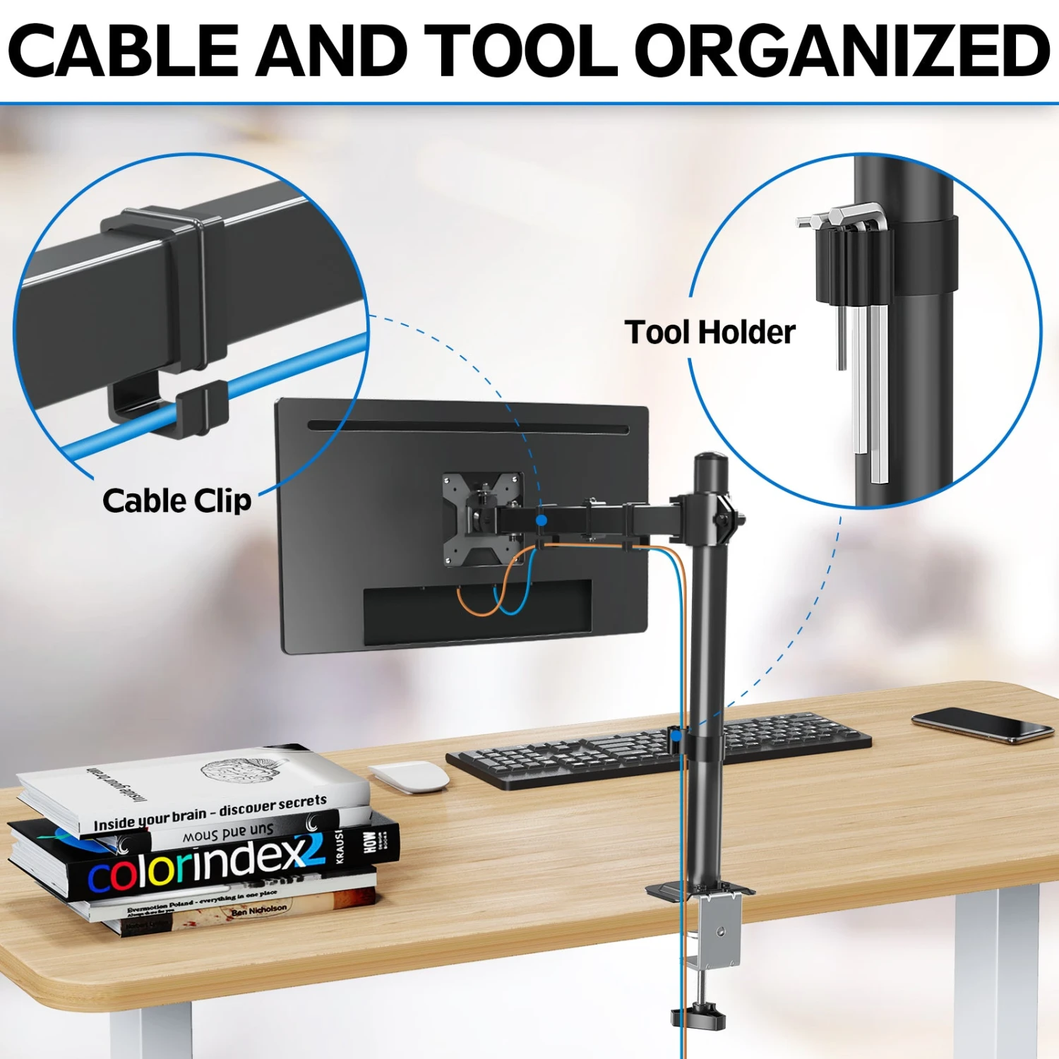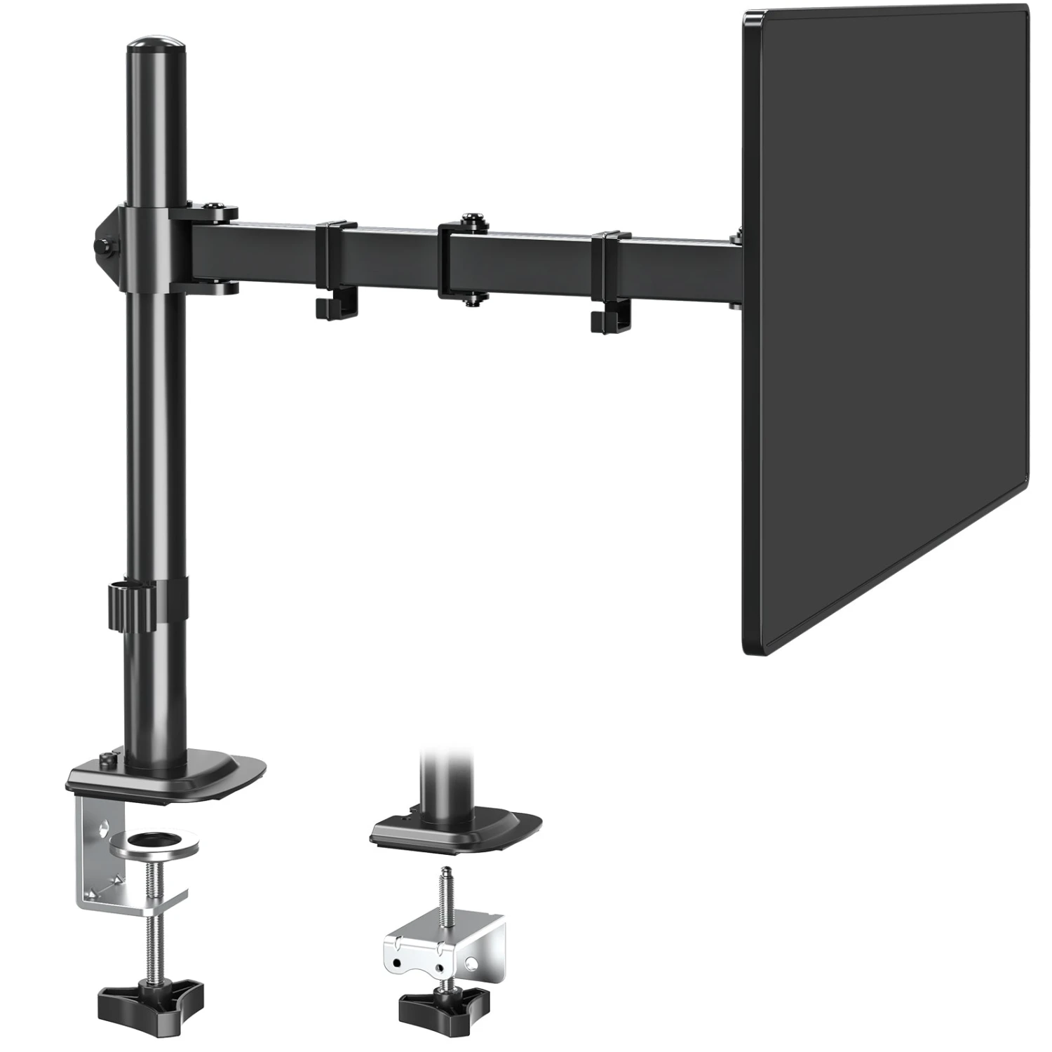<Sturdy Construction>Heavy duty computer monitor stand made from cold-rolled steel securely holds monitor stable in any position. Cable clips keep wires organized and protected. This single monitor mount creates a neat and clean appearance.