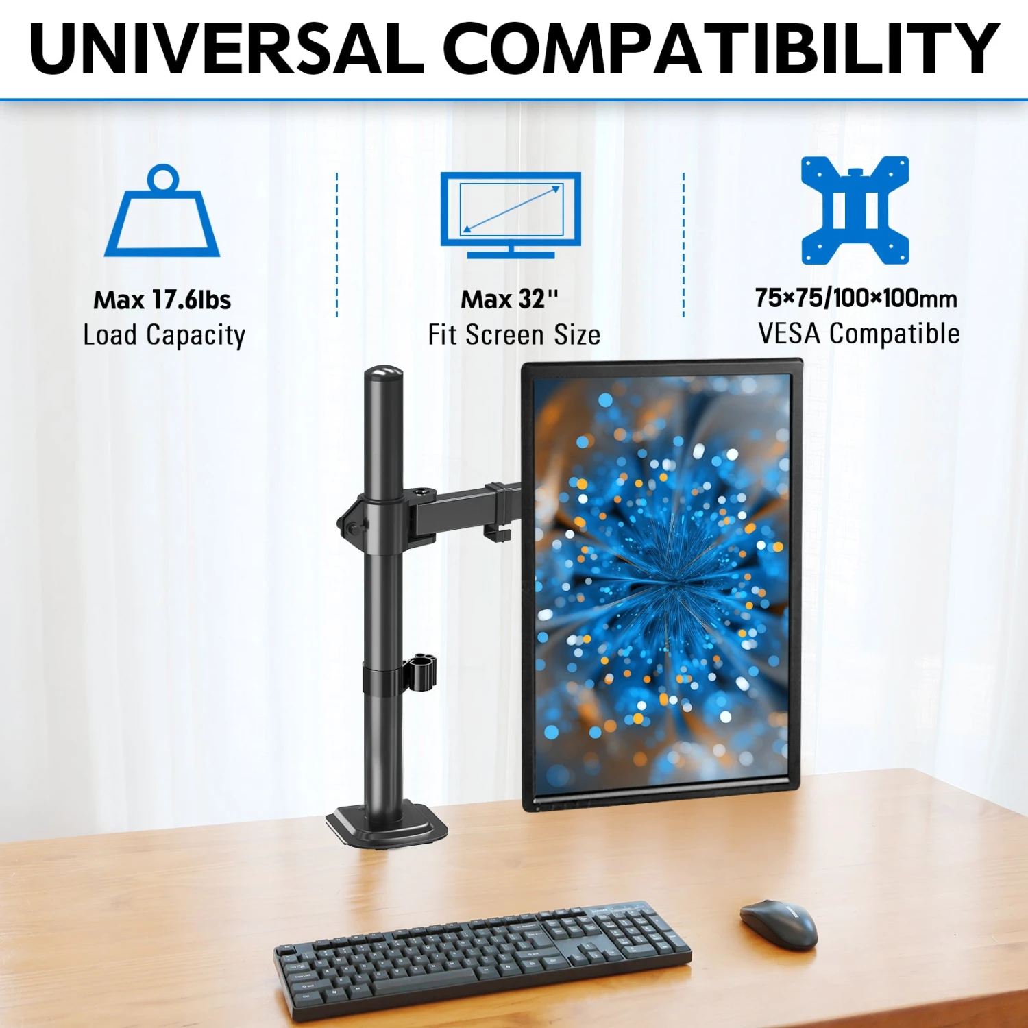 <Universalย Compatibility>The Single monitor mount is designed for most 13โ to 32โ flat screen and curved computer, hold up to 19.8ย lbs, compatible with VESA standard 75x75mm and 100x100mm.ย It fits most monitor brands but is not limited to ASUS, Acer, Samsung, LG, HP, AOC, BenQ, MSI, Dell, Lenovo, etc.