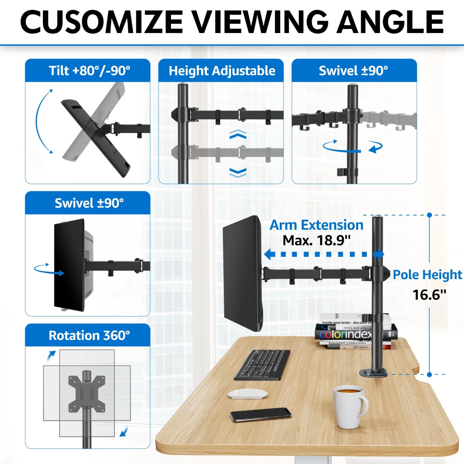 <Full Motion & Height Adjustment>The monitor desk mount allows your screen to tilt up 90ยฐ and down 90ยฐ, 180ยฐ swivel, 360ยฐ rotation from landscape to portrait, and easy height adjustment along the center pole. It can be positioned in many different ways to find an optimal ergonomic position.