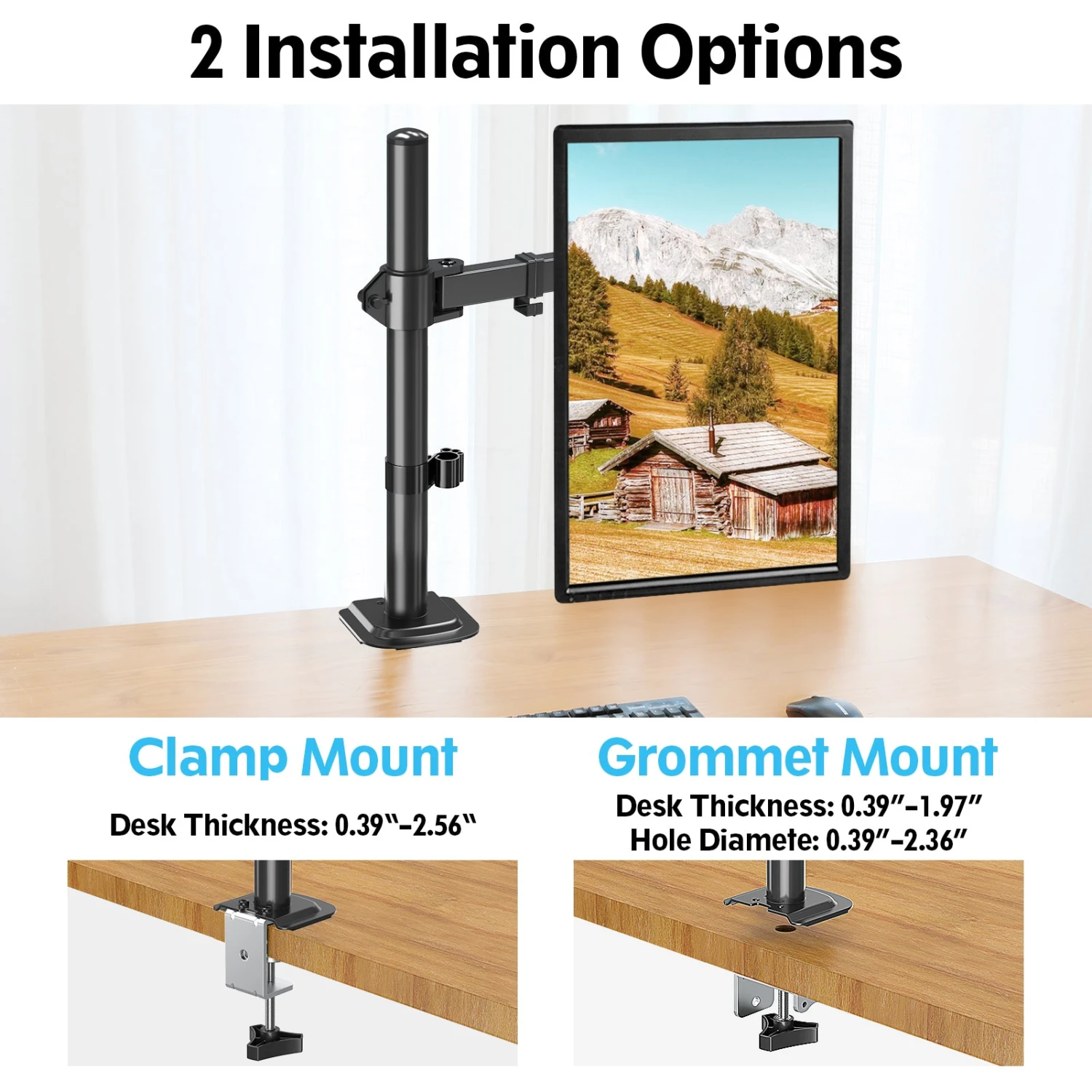 <Easy Assembly>Easy install with interchangeable C-clamp or grommet bases. The Bigger C-clamp is available on request which is suitable for the desk thickness over 1.97”. A removable VESA plate makes it simple to attach or remove your monitor. Installation with clear instruction takes less than 15 minutes from start to finish