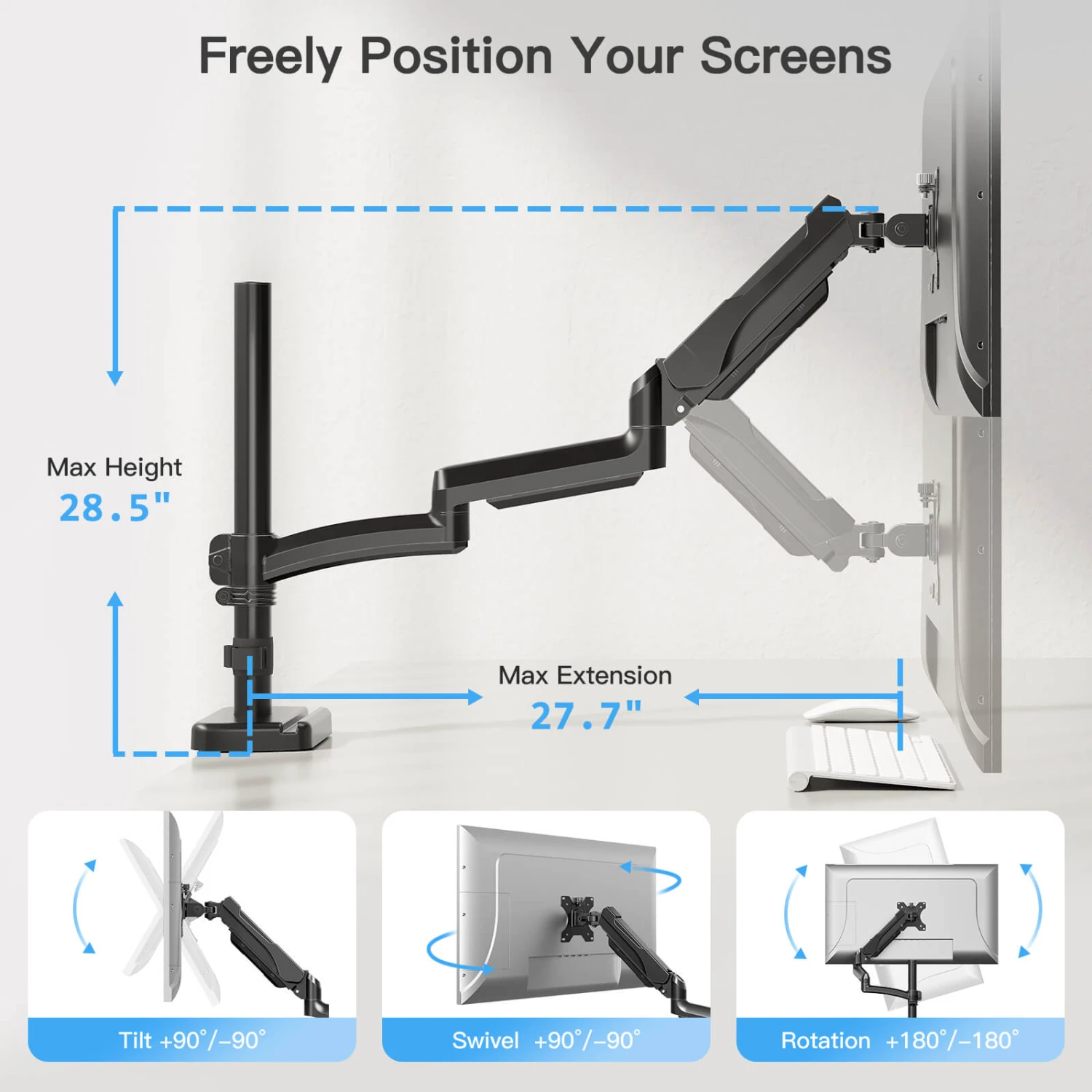 <Full Range of Motion>Find your perfect angle with ease.The gas spring monitor stand offers up to 28.5″ of height adjustment, 27.7″ of extension, and tilt (+90°/-90°), swivel (+90°/-90°), and rotation (+180°/-180°) options, ensuring an ergonomic and customizable viewing experience.