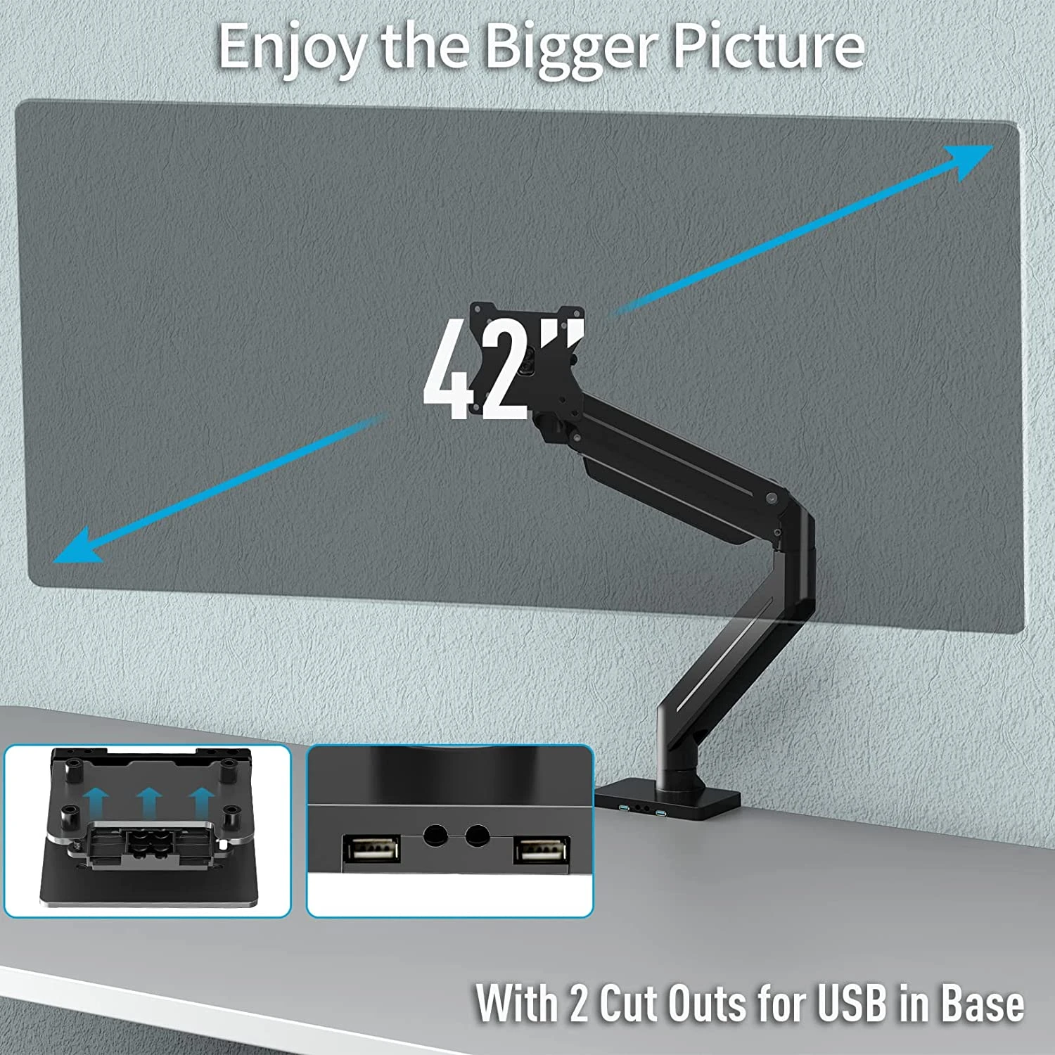 <Upgraded Monitor Arm>Cable management conceals wires within the arm. Getting your monitors off your desktop will provide you with extra room for your favorite desk decor. You’ll have a neater workspace and your day will be more productive without a bunch of wires hanging from your screens.