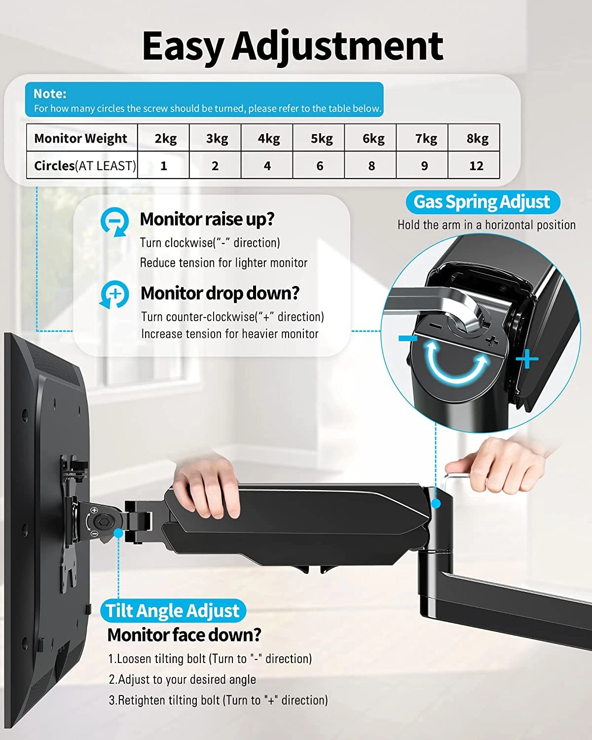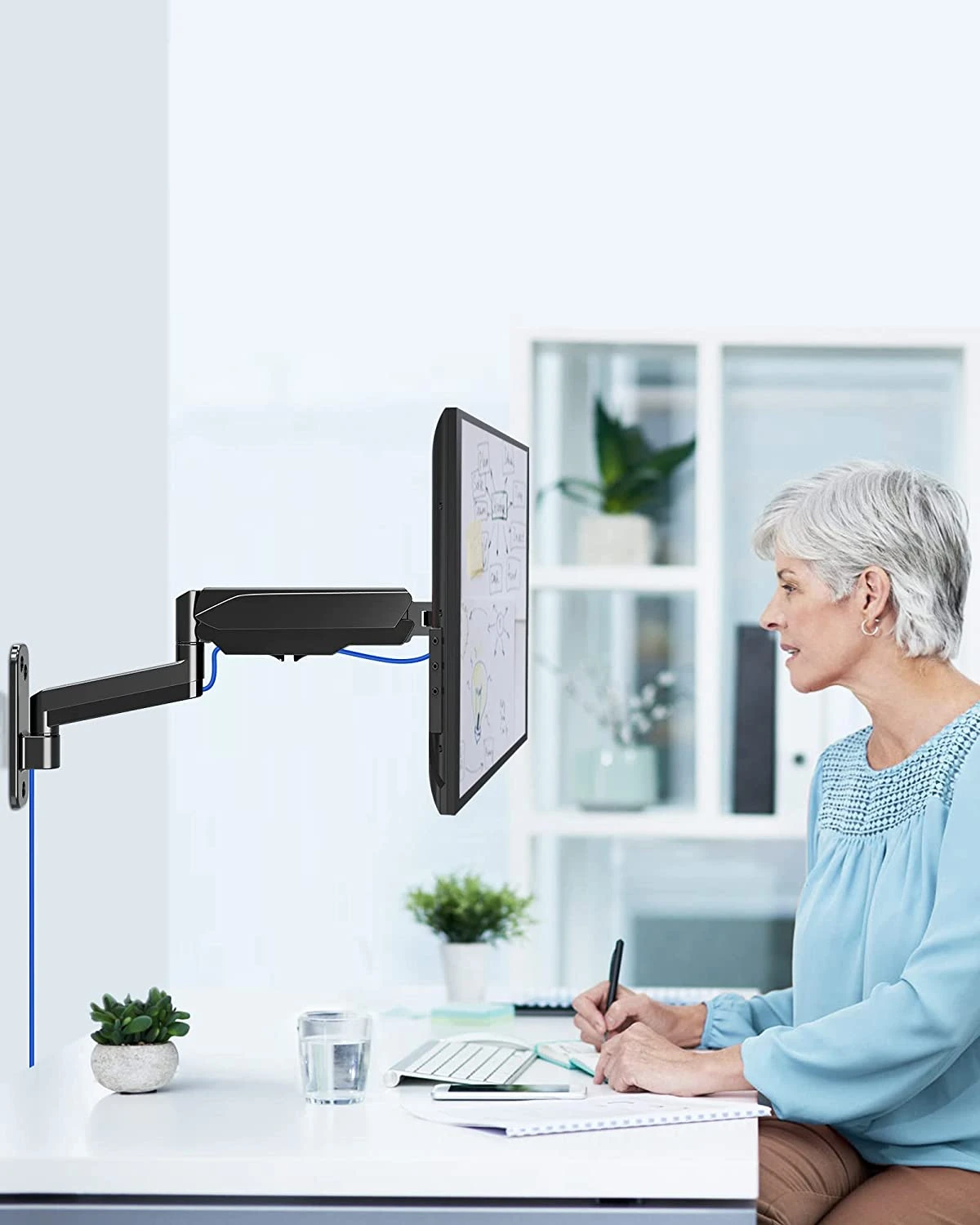 <Robust Build for Longevity>Crafted with quality aluminum and featuring a premium gas spring, our monitor wall mount offers smoother movement and enhanced durability. Its heavy-duty construction ensures a secure hold for your monitor.