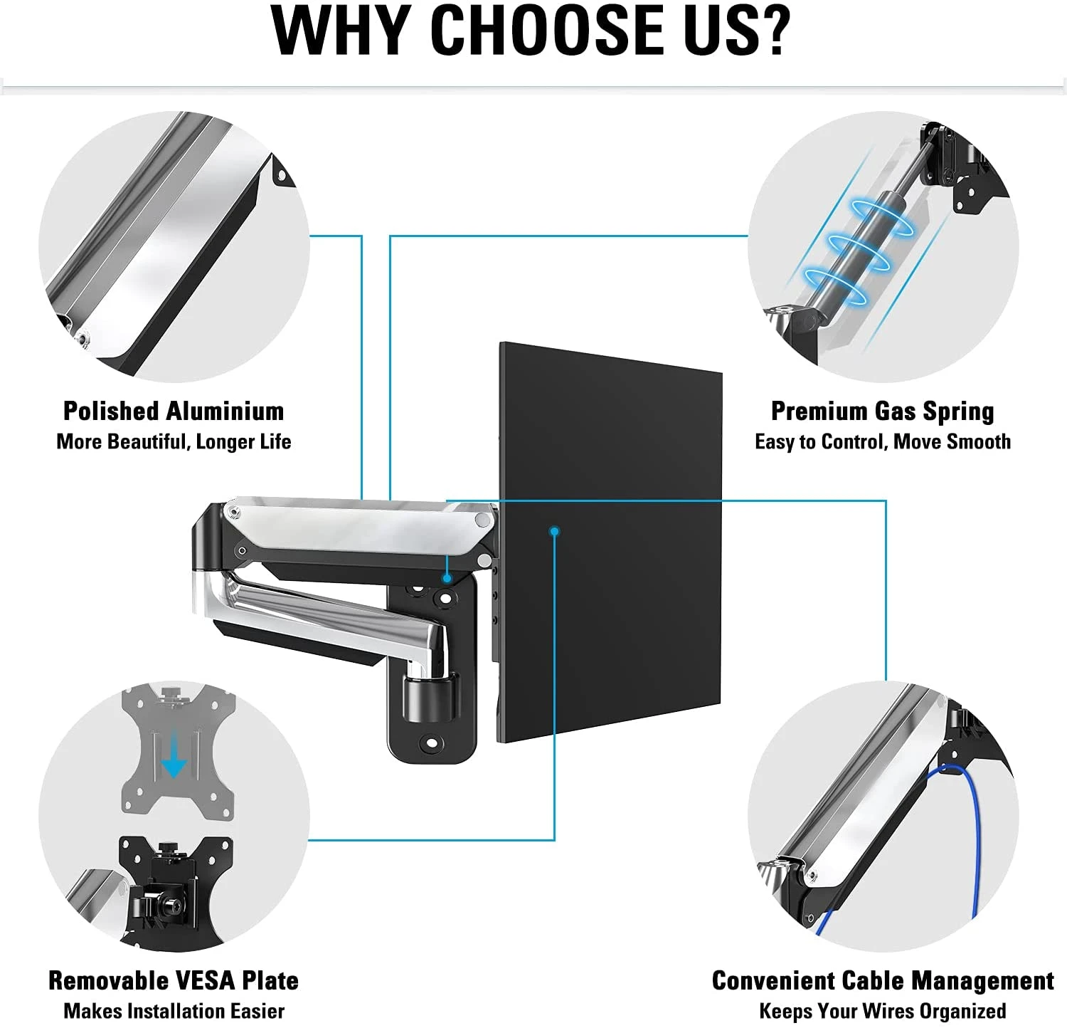 <Save Space & Easy Installation>Instead of mounted on the desktop, the monitor mount holds your monitor on the wall, free up more space on your desk. Comes with clear instruction and all the mounting hardware needed. The detachable VESA plate makes it simple to attach your monitor.