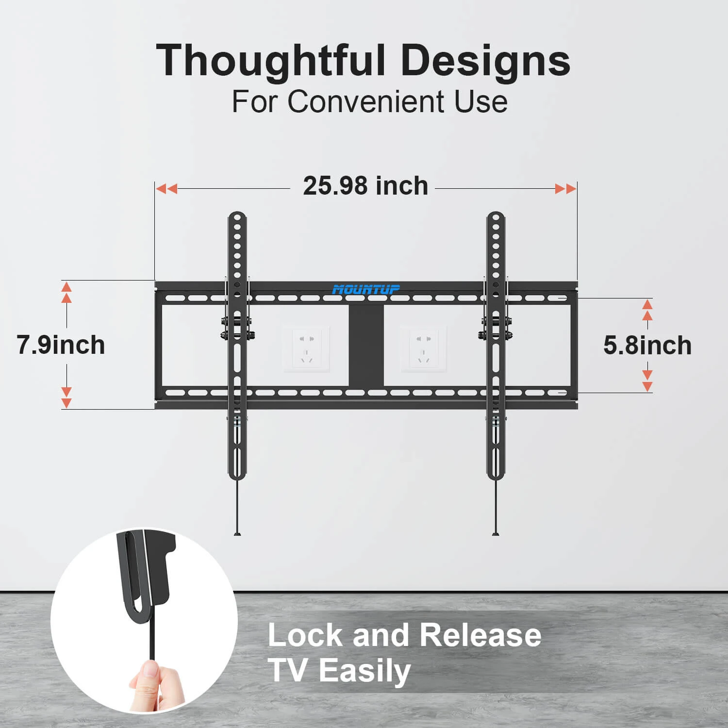 <Convenient wall mount for TV>This wall mount for TV is designed with details for convenient use. The whole mount is constructed of high-quality steel, which makes it secure and sturdy to hang a TV up to 99 lbs. It is safe to use in the living room, bedroom, kitchen, outdoors, or other commercial places. Plus, the wall plate has an open design, which doesn’t block the outlets on the wall.