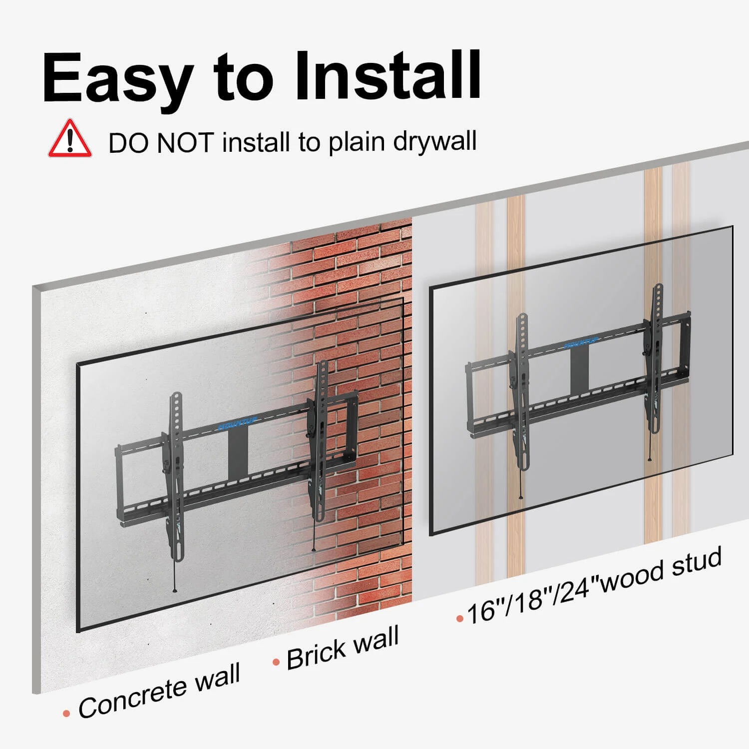 <Easy and simple installation>A tilting TV wall mount is easy and simple to install with its sleek design. The package includes the necessary hardware and bolts. Installation takes 3 simple steps. 1. Install the wall plate to the wall. 2. Attach TV brackets to the TV. 3. Hang the TV on the wall plate. After that, simply pull the straps on the TV brackets, and the TV can be secured and locked for safe use.